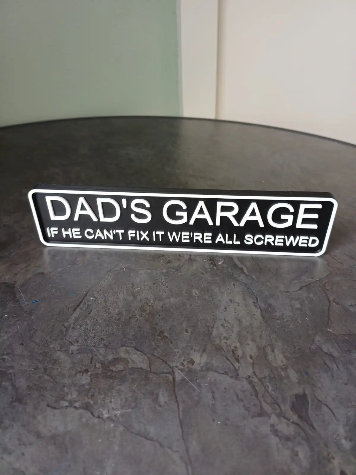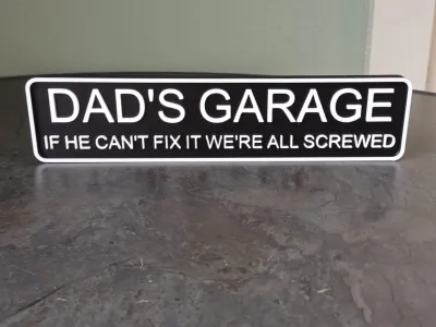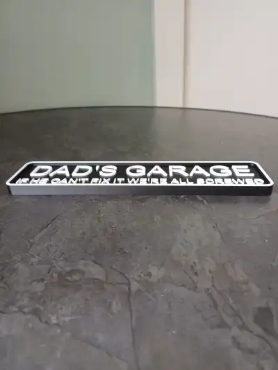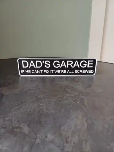 Verleihen Sie Ihrem Arbeitsplatz mit diesem „Dad’s Garage“-Schild eine humorvolle Note. Mit dem markanten Schriftzug „Wenn er es nicht reparieren kann, sind wir alle am Ende“ ist dieses 3D-gedruckte Schild ideal für Garagen, Werkstätten oder Männerhöhlen.