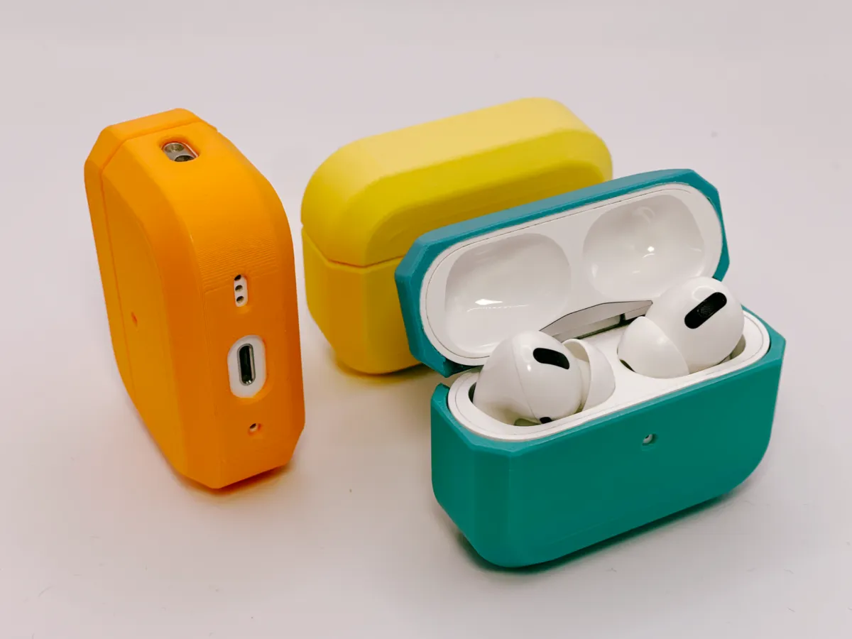 Printable case for Apple AirPods Pro with flat edges. I've designed dedicated versions for the AirPods Pro and AirPods Pro 2 case. Their dimensions are identical but 2 features cutouts for the bottom speakers and the side holes to attach a carry band.