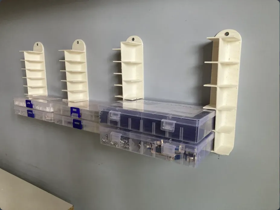 In an effort to organize my workspace, I made these brackets to mount the cheap, small parts containers that many things from amazon come in. Also, these boxes are available for less than a dollar each if I need more.