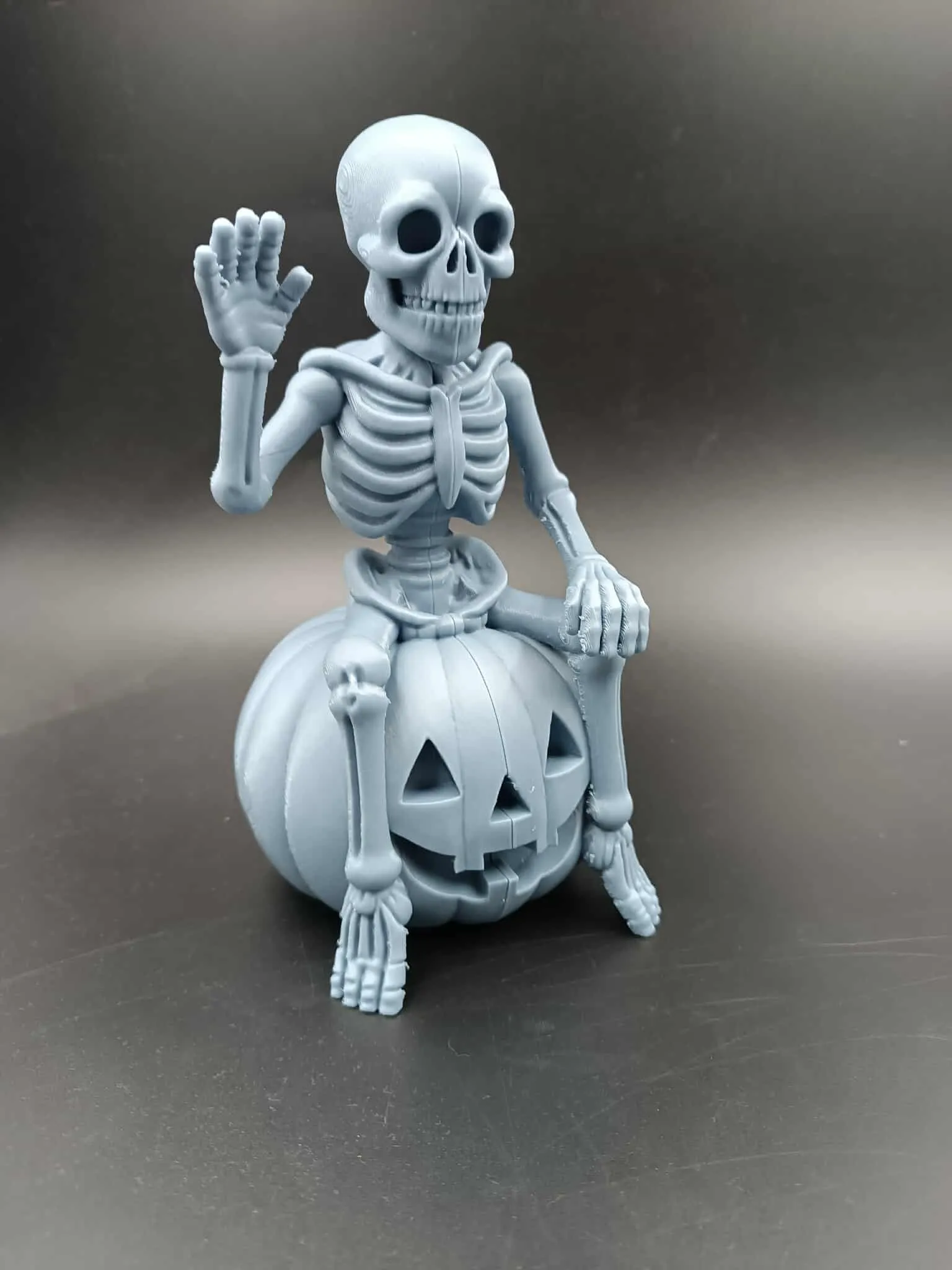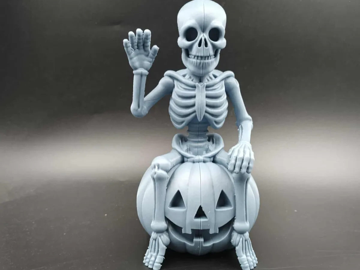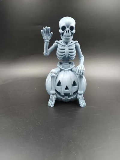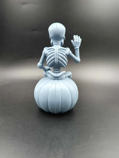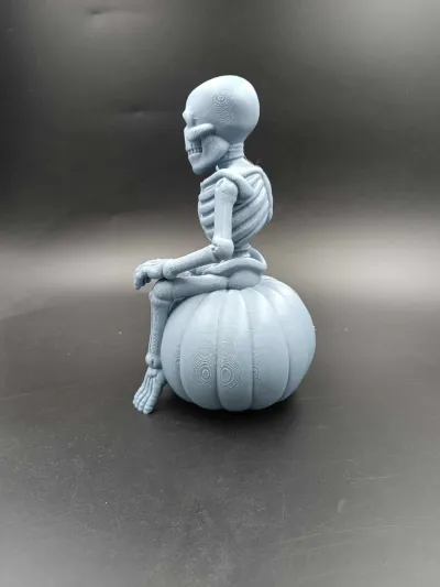 This Halloween decoration features a cheerful skeleton sitting atop a carved Jack-O’-Lantern, ready to greet all who dare to approach. Printed in grey PLA, the model comes split into two parts, requiring glue for assembly.