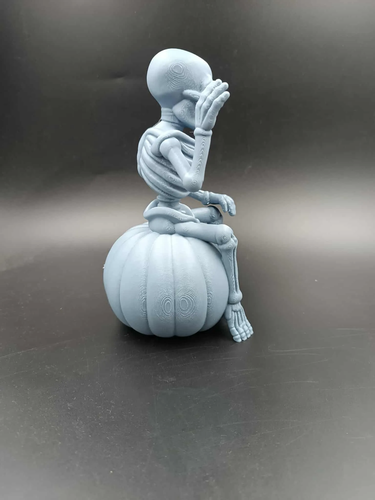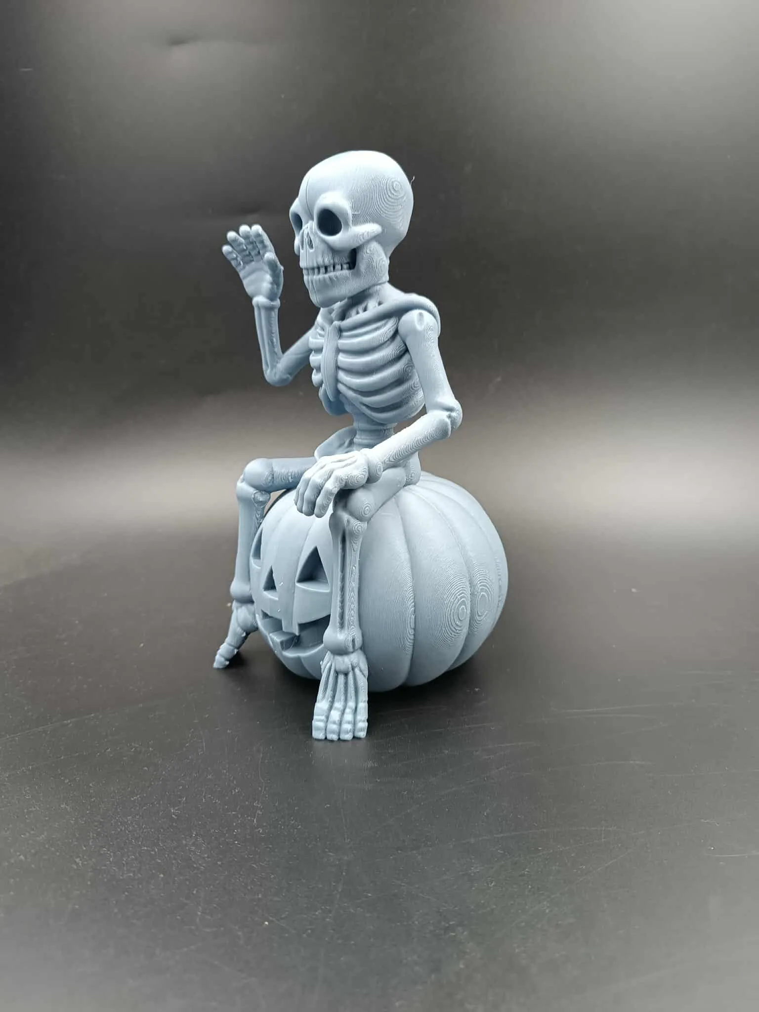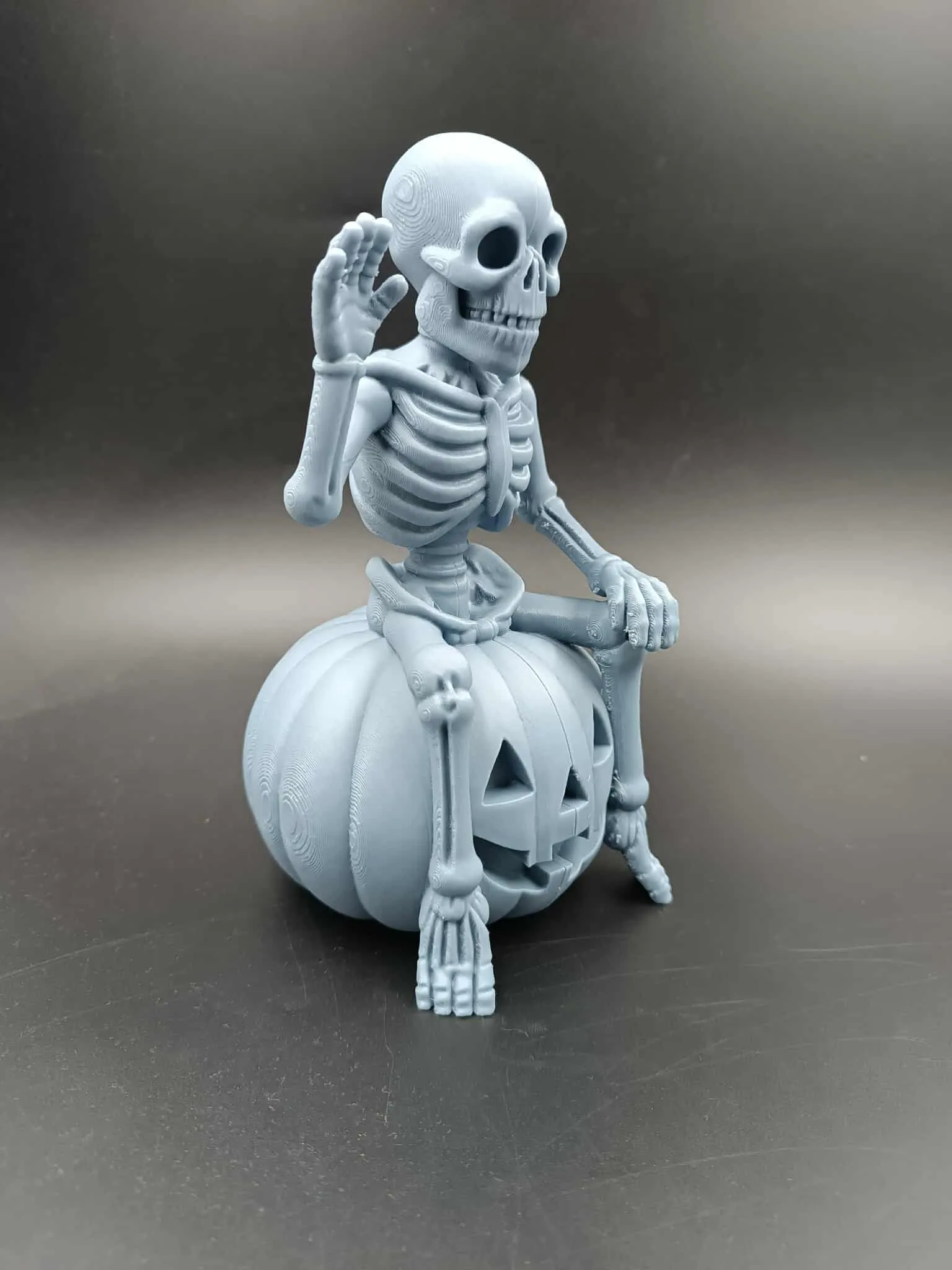 This Halloween decoration features a cheerful skeleton sitting atop a carved Jack-O’-Lantern, ready to greet all who dare to approach. Printed in grey PLA, the model comes split into two parts, requiring glue for assembly.