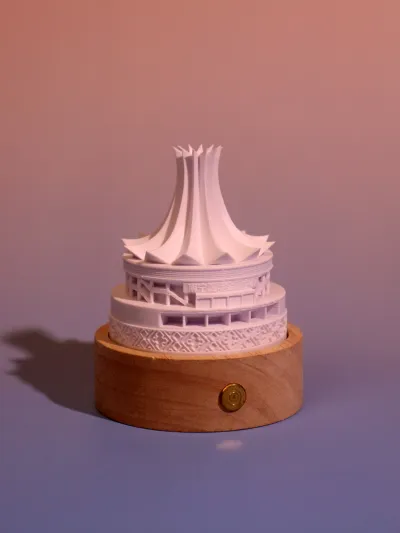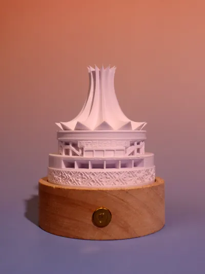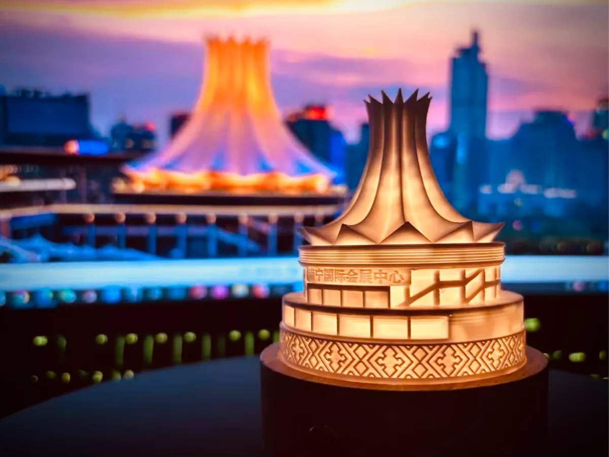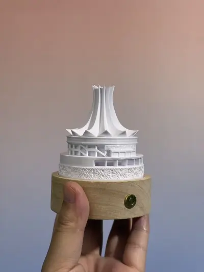 The architectural model of the Nanning International Convention and Exhibition Center incorporates Zhuang brocade motifs at its base; paired with a lighted pedestal, it doubles as a cozy little nightlight—and stands beautifully on its own as a decorative tabletop accent!