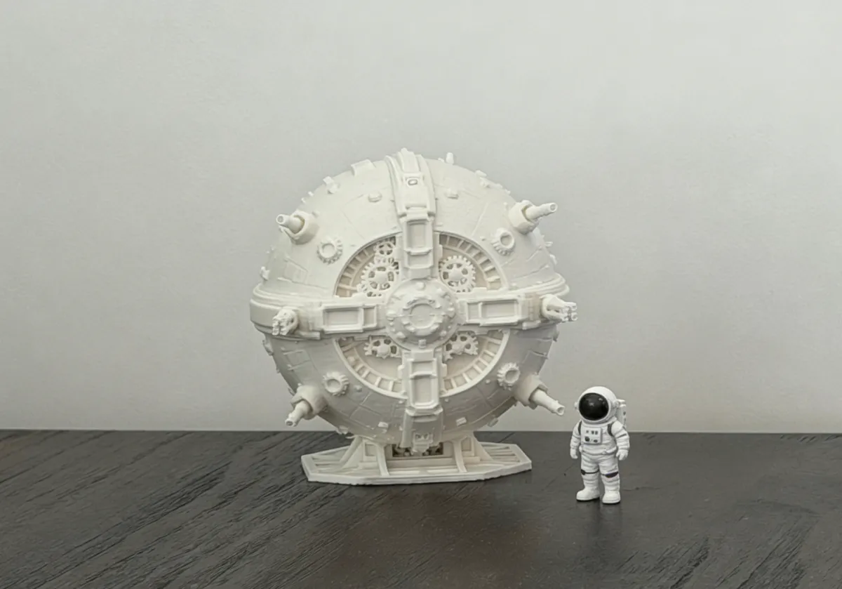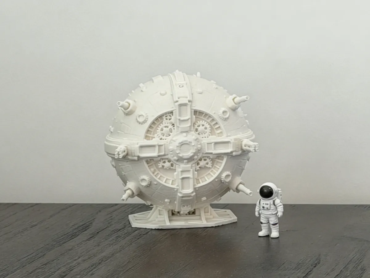 This spherical sci‑fi warship model is the ultimate embodiment of hardcore mechanical aesthetics! The intricate interlocking gears, seamless ring-shaped armor joints, and multiple propulsion turrets meticulously capture the textured allure of deep‑space vessels, layer by layer. The pristine white base perfectly highlights the structural tension, making this a coveted centerpiece for any sci‑fi enthusiast’s desk—simply wait for it to be painted and finished, and you’ll unlock your very own interstellar warship in no time.