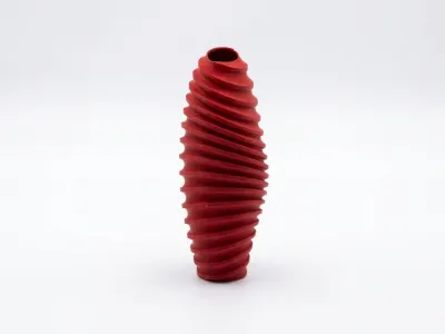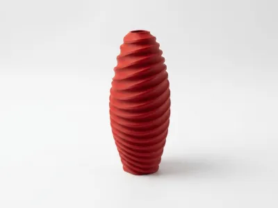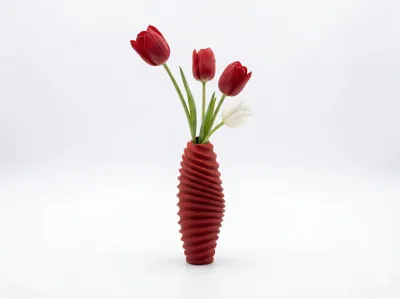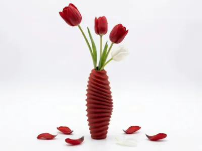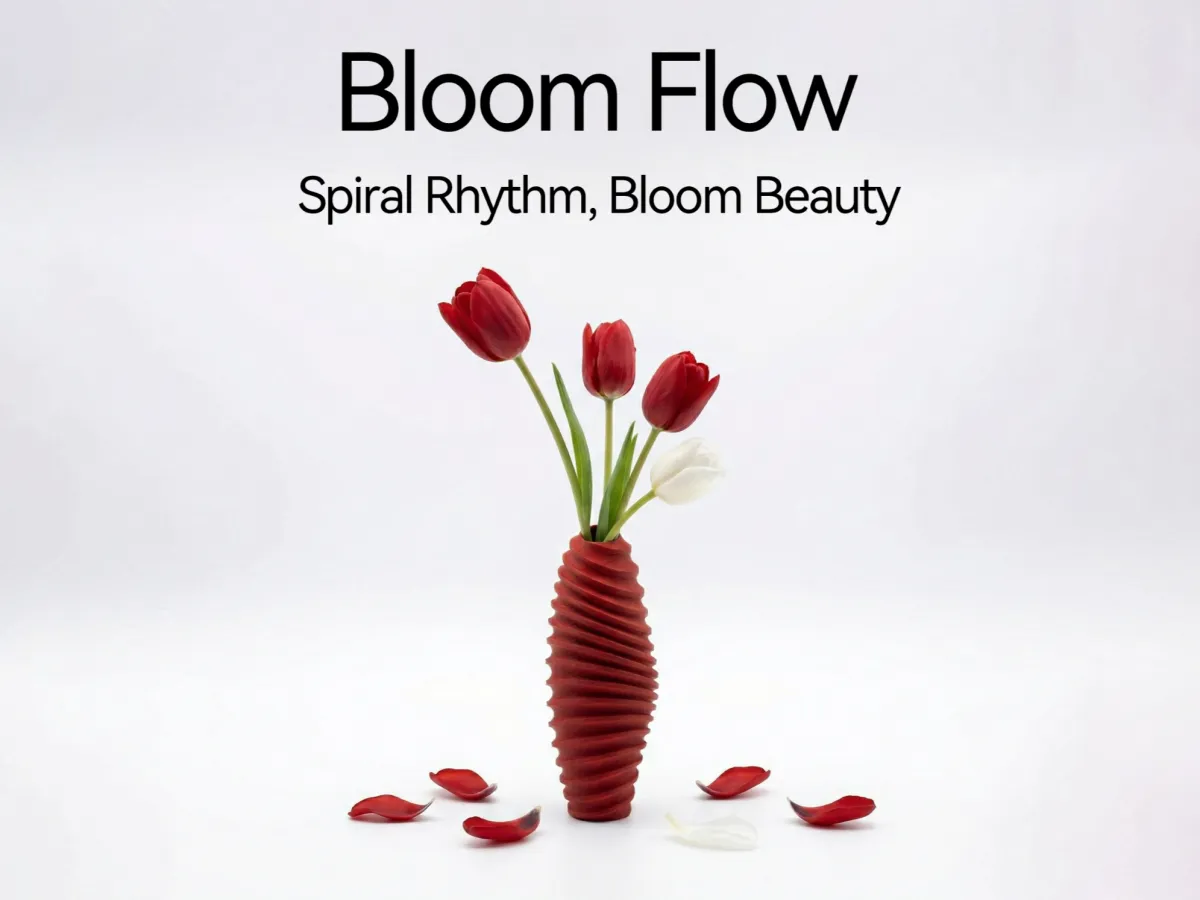 A 3D-printed artistic vase specially designed for fresh-cut flowers, featuring a spiral, streamlined design that allows the floral materials and the vessel to complement each other, amplifying their beauty twofold.