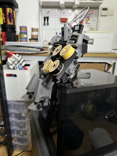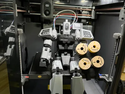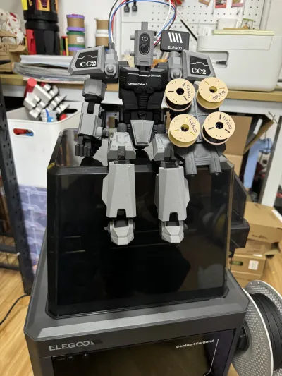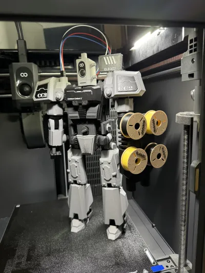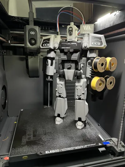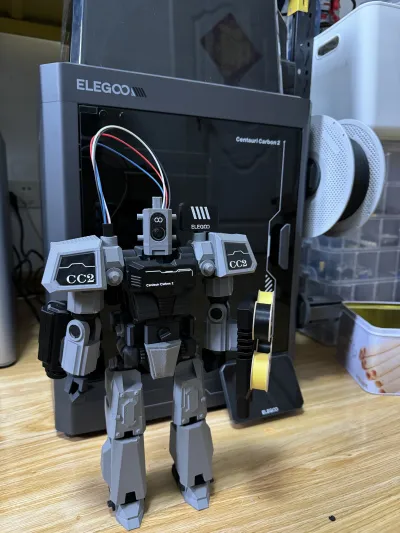 Full PLA filament printing, a mecha design specifically tailored for the CC2. The mecha head is modeled after the CC2 print head, with the left-hand firepower component serving as a filament holder attached to the CC2 side panel, along with decorative patterns on the chest and shoulders.