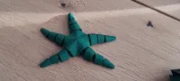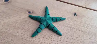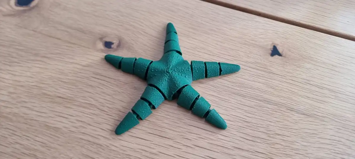 The starfish has a central hexagonal body with five tapering arms. Each arm is divided into three hinged segments, allowing it to wiggle and move flexibly rather than being a rigid statue.