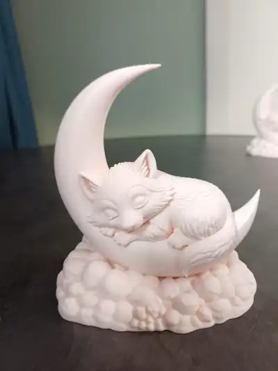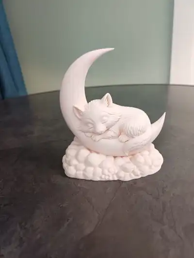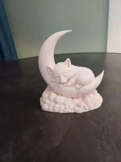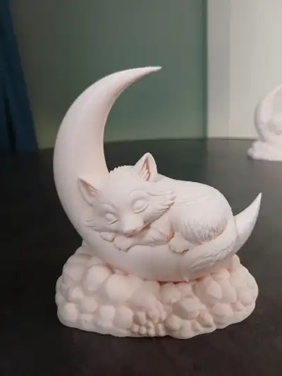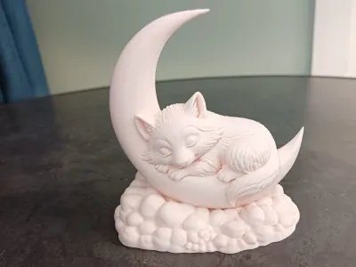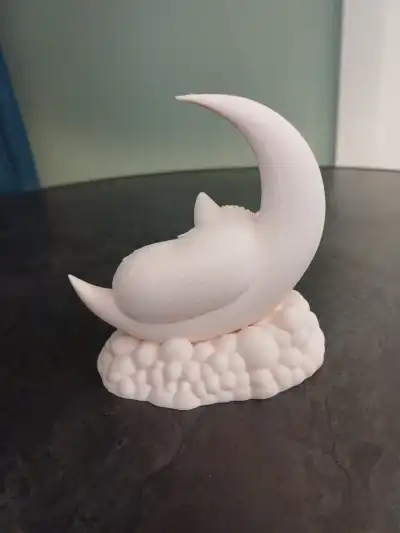 A cute baby wolf peacefully sleeping on a crescent moon, resting on a soft bed of clouds. This dreamy design makes a perfect decoration for a nursery, desk, or shelf. The fluffy fur details and calm pose give the model a magical and cozy look.