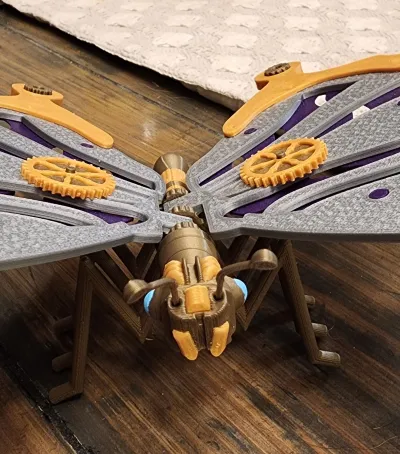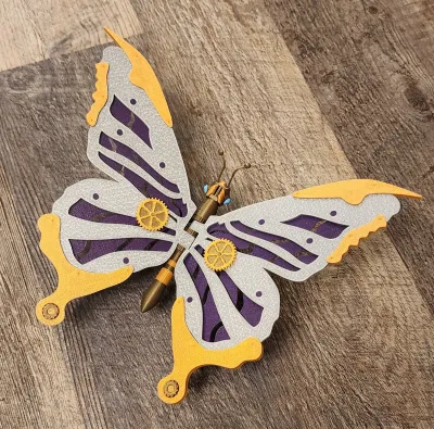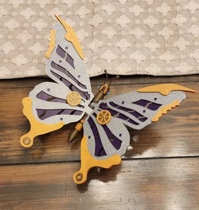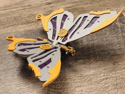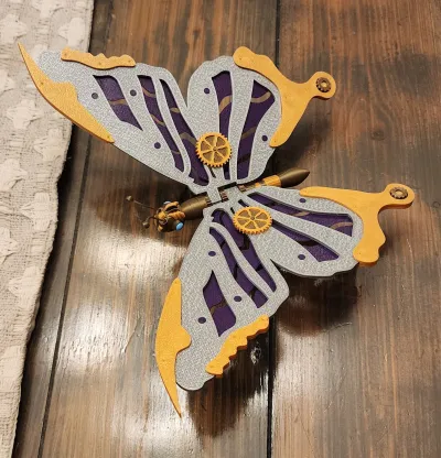 Introducing my first steampunk butterfly design. It is customizable - being that you can add accessories that you like. This model also comes with normal legs, a desk stand base with legs (more stable), and a wall mount. Very small amounts of glue may be necessary when attaching the thin colored parts of the wings to the main wing body as well as the “armored” pieces. You may also want to glue the tail section to the mid-pole section if the fitment is not tight enough.