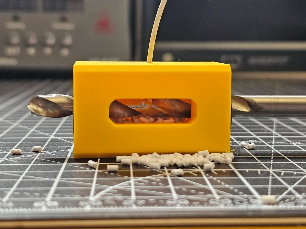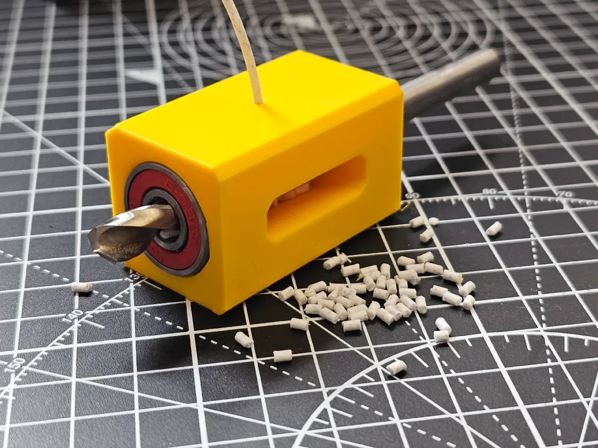 Small model that perfectly and quickly cuts filament into 4mm lengths using a drill.