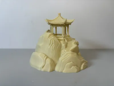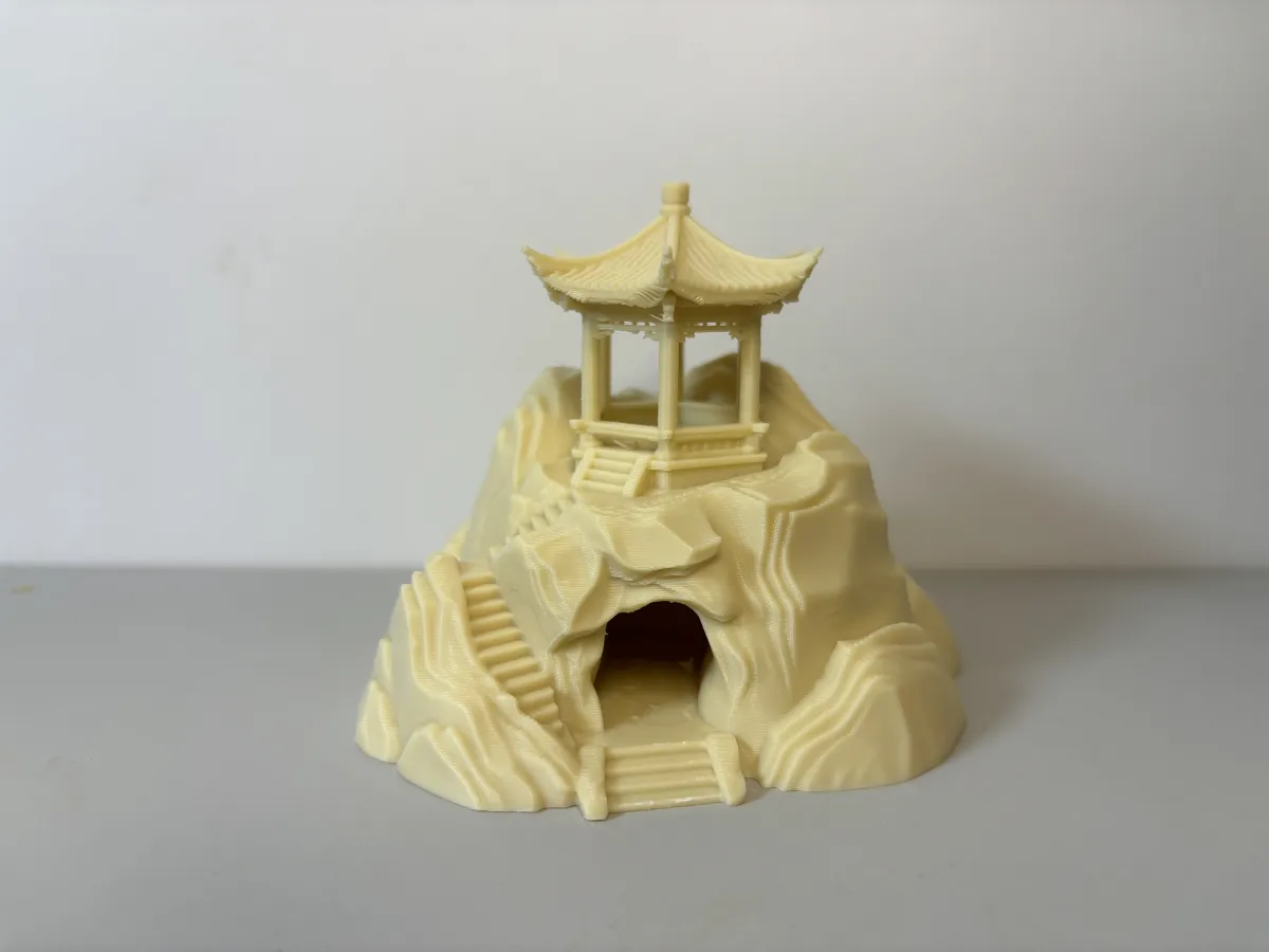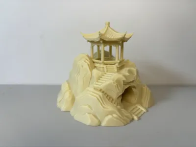 The model is based on the freehand style of traditional Chinese landscape painting, meticulously replicating the layered, rugged texture of mountains and rocks. The natural, three-dimensional rock wall patterns faithfully convey the undulating, tactile quality of real stone. A spacious arched cave is carved into the front face of the mountain, providing a safe haven for fish, shrimp, and snails to hide, rest, and reproduce—while also serving as the visual focal point of the aquarium. Ascending along the stone steps, one reaches the summit, where a highly detailed Chinese-style hexagonal pavilion stands tall: its elegantly upturned eaves and gracefully curved corners capture the lively charm of ancient architecture, while the pillars, railings, and steps are rendered with crisp, well-defined details, evoking a miniature mountain pavilion that instantly imbues the aquarium with the Eastern aesthetic of “an ancient temple hidden deep in the mountains.”