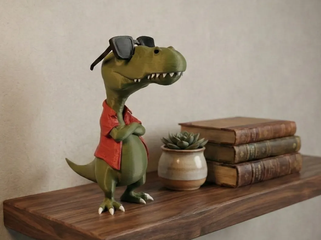 Get ready to print some serious attitude with this awesome T-Rex figure! Decked out in stylish black sunglasses and a casual open red shirt, this isn't your average prehistoric predator. He's the boss of the shelf, the king of cool.