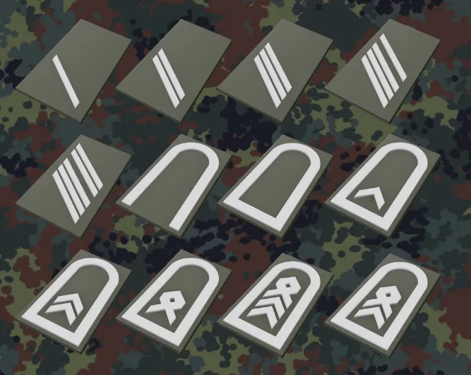 You need to print the "base-rank-sign" (Schulterklappe) in olive. Decide what rank you like to print and print the insignia in white or black (both are official). Than glue all parts together.