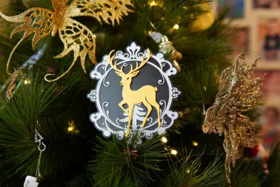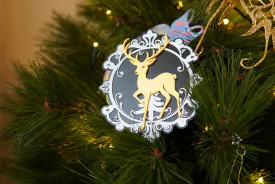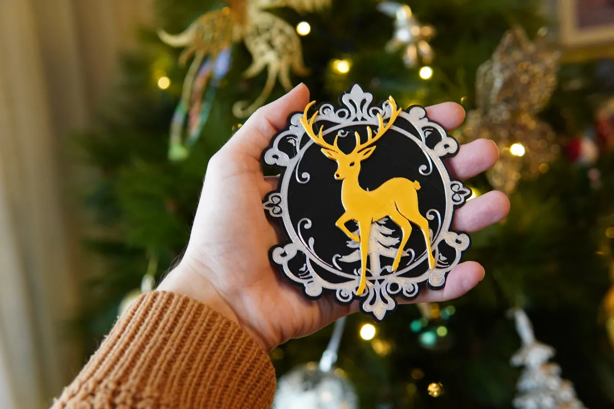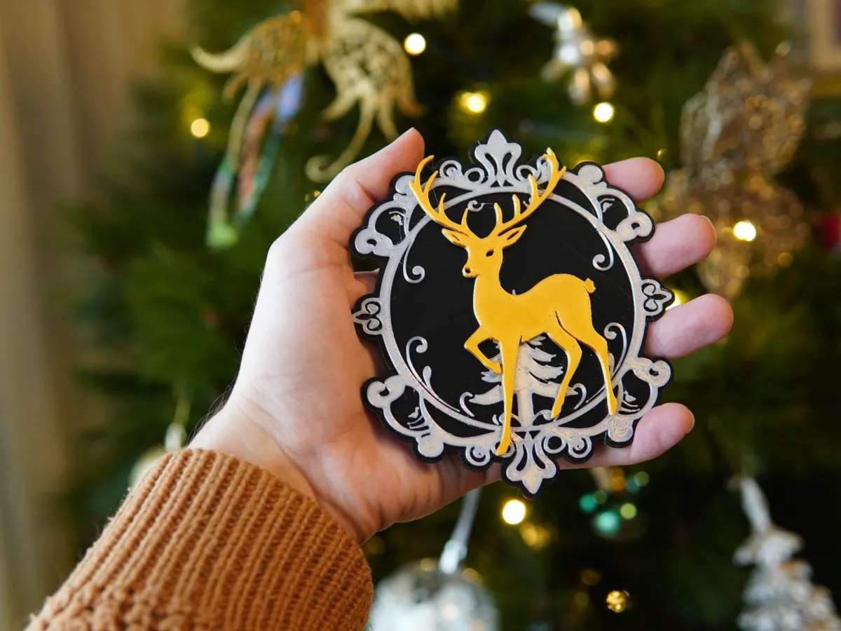 A simple reindeer decoration. It has a ironing layer on top which may not come out great using silk, so I recommend a matte for the top.