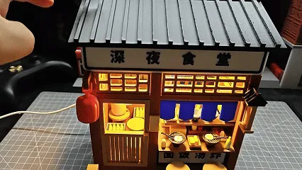 Core Translation: The model’s overarching design reflects a quintessentially Japanese style, where each element—from the delicate roof tiles to the rustic wooden doors and windows—is thoughtfully crafted down to the smallest detail. When bathed in warm illumination, the cozy, inviting atmosphere comes alive in an instant, as though you can truly glimpse the soft, golden light spilling forth from a late-night dining establishment, enveloping all who enter in a sense of deep tranquility and heartfelt warmth.