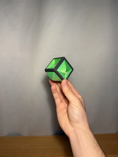 The combination of rigid outer frame and flexible internal segments makes it suitable as both a desk decoration and a handheld fidget.