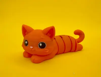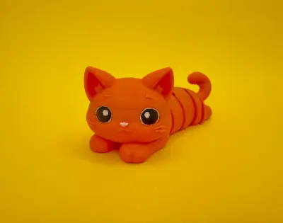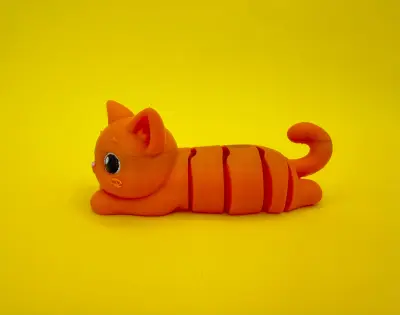 An adorable articulated cat designed in a playful and charming style. The cat is lying on its belly with a relaxed pose, featuring smooth, rounded shapes and expressive large eyes that give it a cute and friendly personality. Its segmented body allows for flexible movement, making it both a fun fidget toy and a decorative piece.