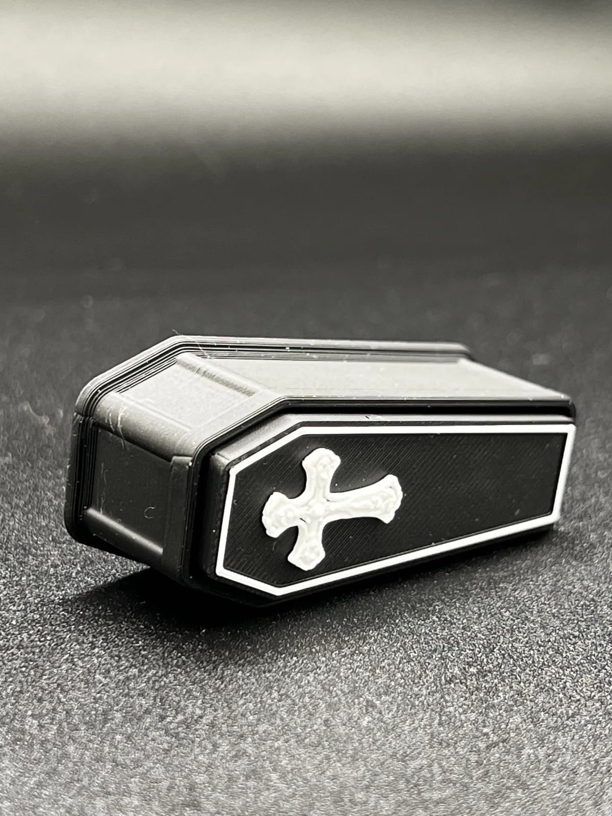 A spooky yet fun coffin fidget clicker toy with a cross on top.