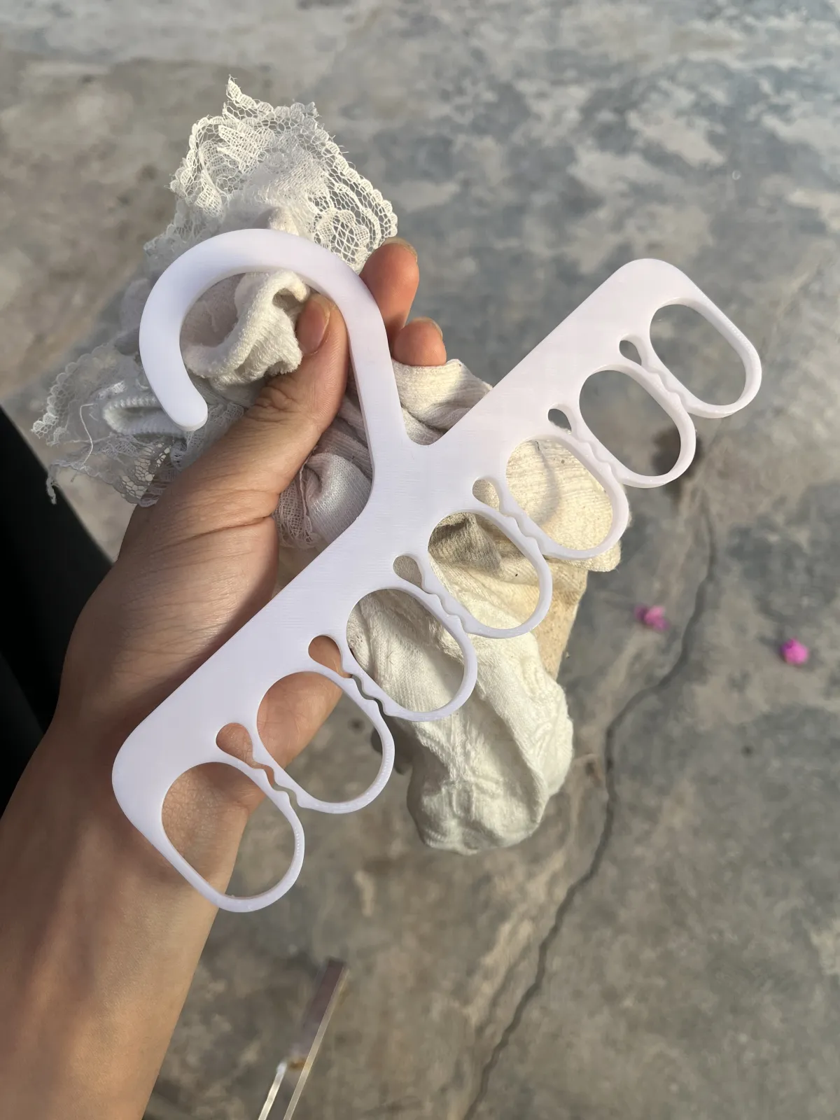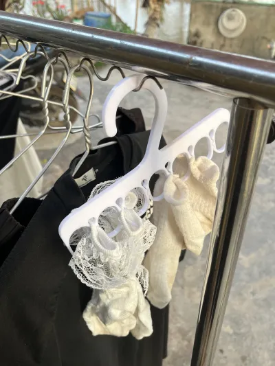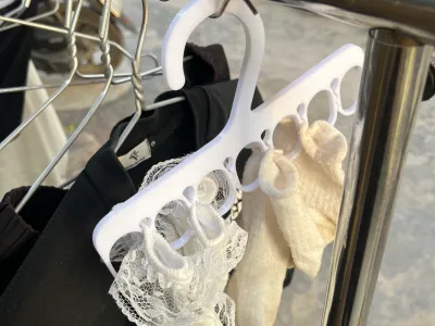 This is a 3D-printed sock hanger designed to dry and organize multiple pairs of socks at once. It features several evenly spaced loops that securely hold socks in place, allowing good airflow for faster drying. The integrated hook makes it easy to hang on a clothes rack or line, providing a compact and convenient laundry solution.