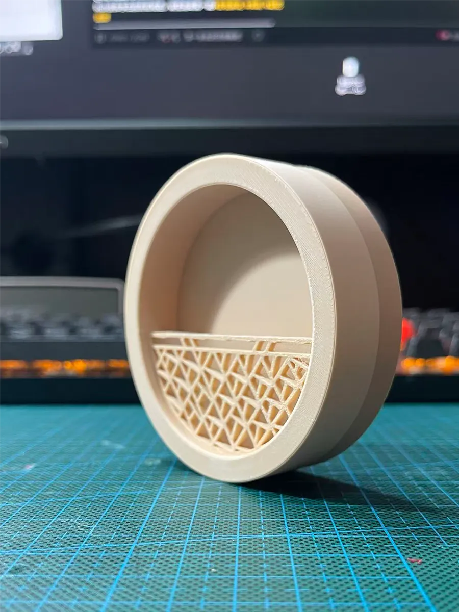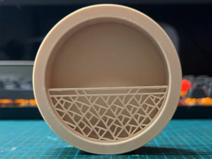This is a circular window featuring traditional Chinese lattice window elements. It is one of a complete set of six designs, each with a different lattice pattern. The **upper half** of the window is **completely hollow/open**. A transparent panel is set behind the lattice section, which was printed using a transparent material/filament. The back of the whole piece requires three round magnets with the dimensions of 7.9 mm}in diameter and 2.8 mmin thickness.