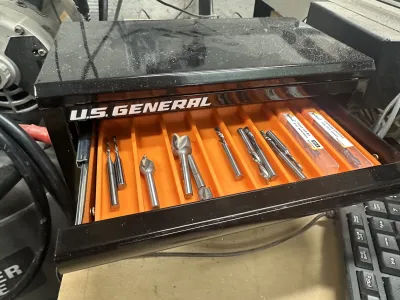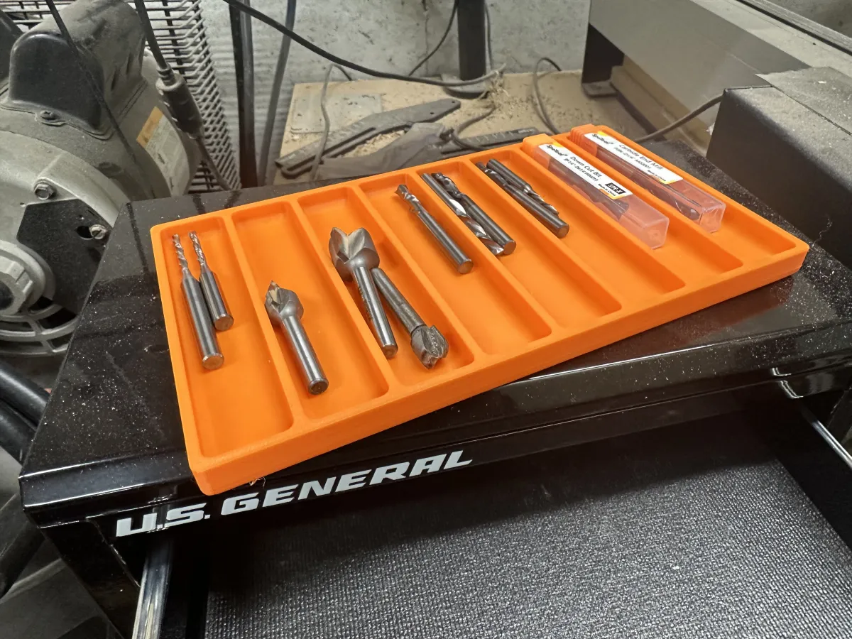 This tray fits in the top most drawer of the box. Holds random assortment of CNC router bits.