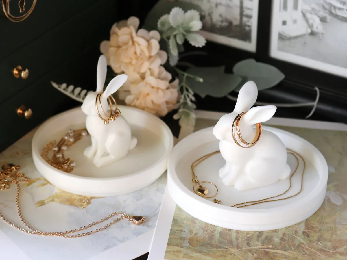 A round tray with a rabbit placed in the center is a practical accessory that also serves as a decorative element.