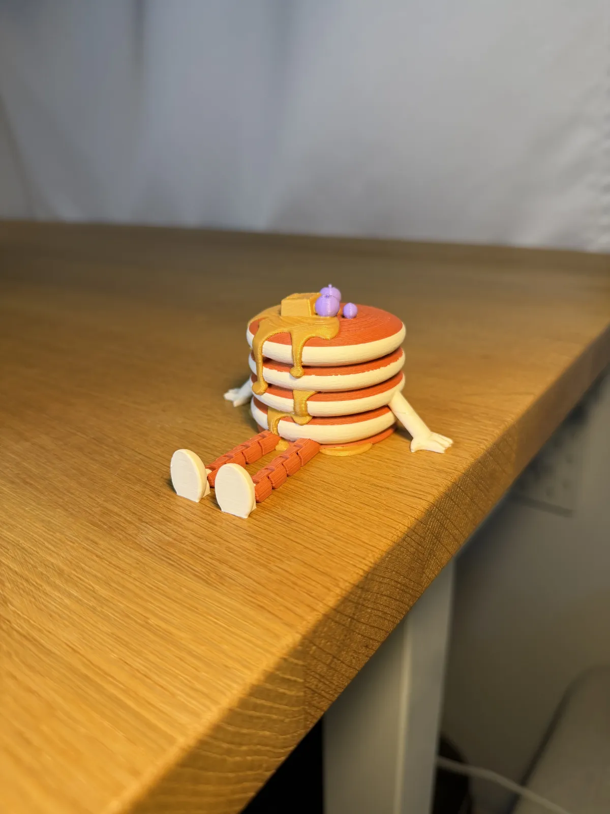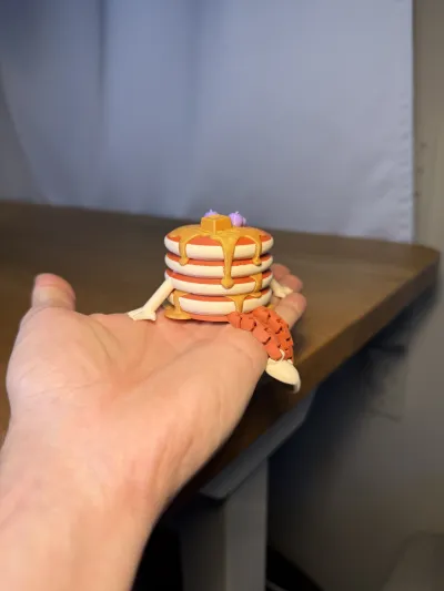 The model features movable legs connected with print-in-place joints, allowing simple posing and interaction. The arms are fixed, while the stacked pancake layers with syrup detail give it a playful and recognizable look.