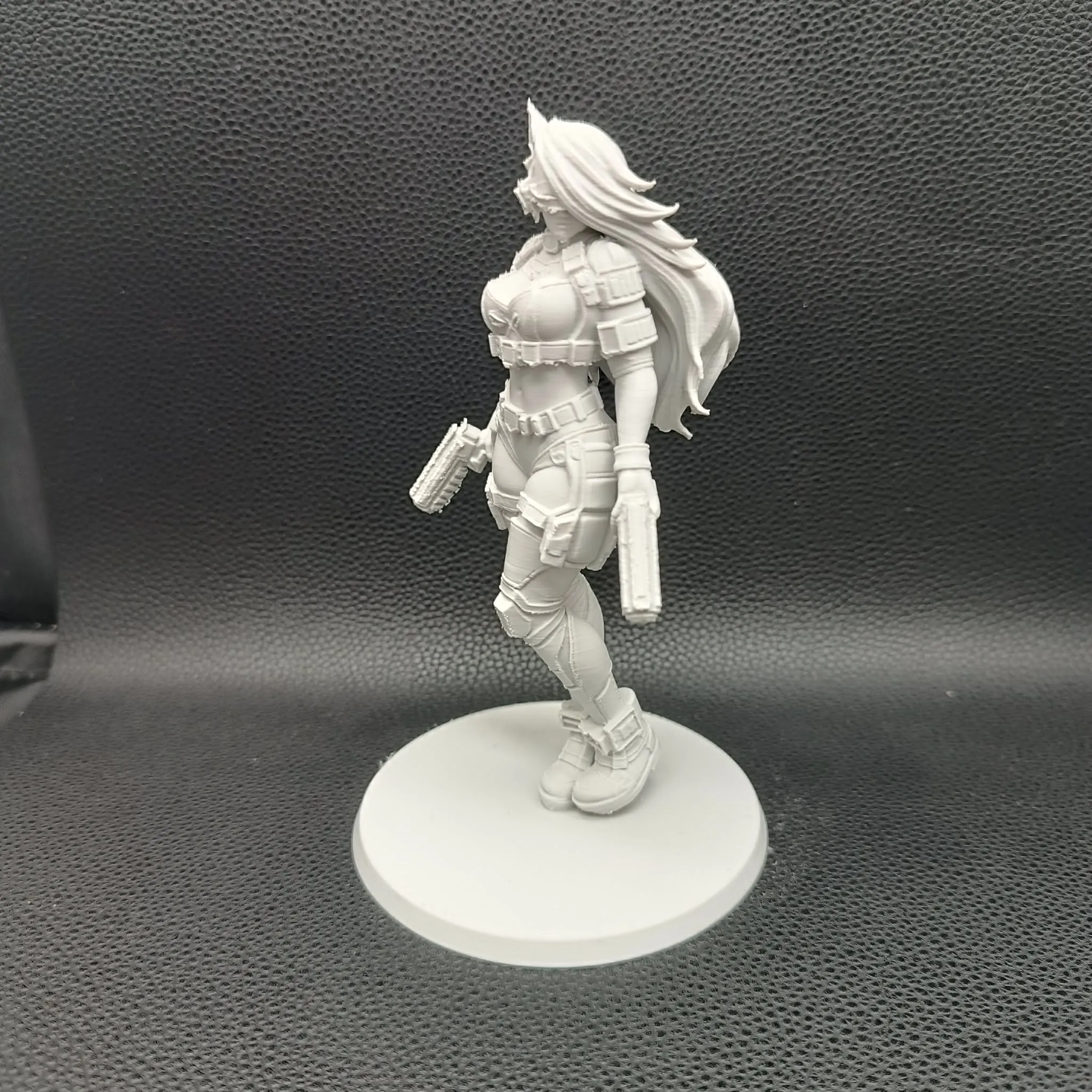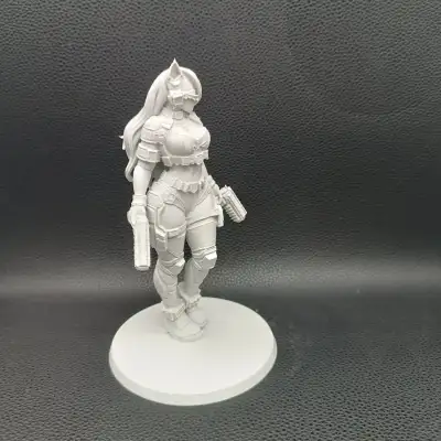 This dynamic 3D printed figure captures a fierce cyberpunk heroine, armored in futuristic tactical gear and wrapped in raw urban attitude. Standing with confident poise, dual pistols in hand, she feels like she has just stepped out of a neon-lit battlefield where chrome meets adrenaline. Her detailed bodysuit, layered belts, armored plates, and sleek visor create a powerful fusion of sci-fi elegance and combat-ready strength. Printed in FDM with supports for stability and clean form, the model offers sharp mechanical detailing, bold curves, and a commanding silhouette that turns any shelf into a dystopian cityscape. Perfect for collectors, painters, and fans of cyberpunk aesthetics, this figure delivers style, danger, and futuristic charisma in one striking piece.