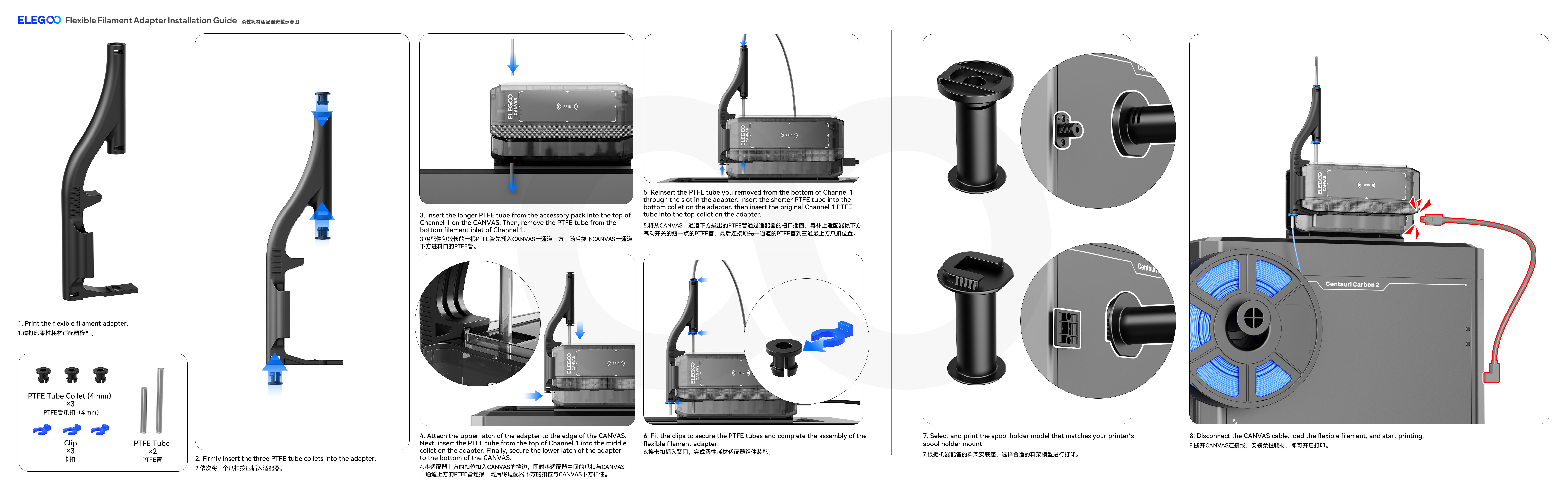 • The long PTFE tube (approx. 48mm length specification as provided, 4 mm inner diameter) should be inserted into Canvas Channel 1 (upper inlet).