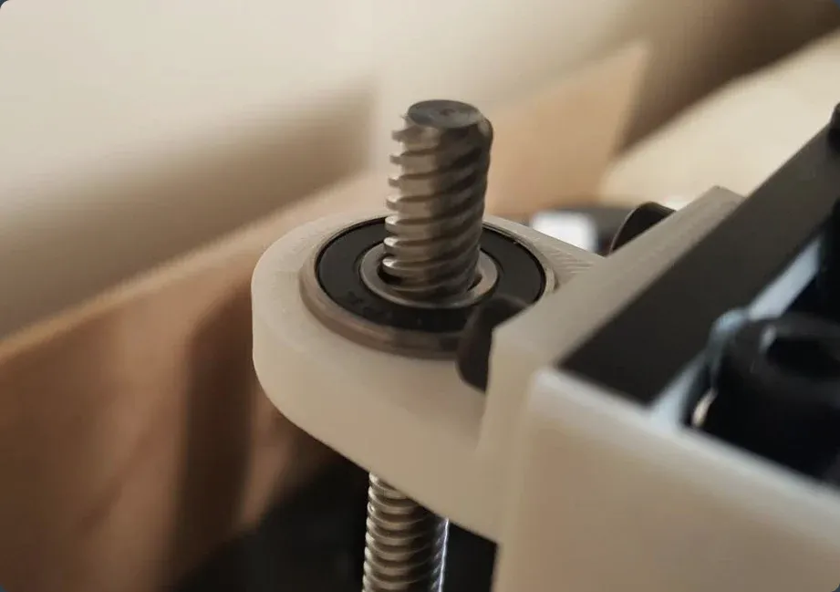 A stabilizer for the top of the Z axis lead screw. Uses a 608-2RS bearing to hold the lead screw and two M4*10 screws with hammer head nuts to secure to the top extrusion.