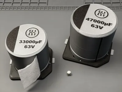 BTW: I printed the big capacitor first and used a fillet instead of a chamfer on the top edge, which turned out poorly when printing upside down. This has already been fixed in the design, so your print will look good, just like the small version.