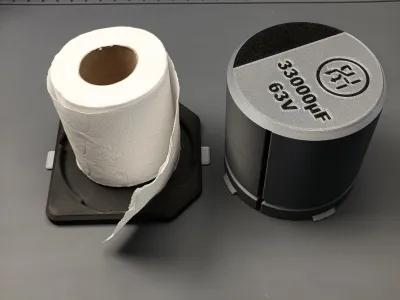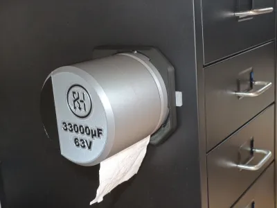 I work with electronics and use toilet paper daily to clean soldering flux and thermal paste. A roll of toilet paper on the bench, however, looks quite bad and out of place… so what better than a huge SMD electrolytic capacitor toilet paper dispenser? 😅