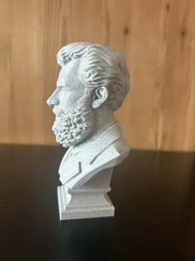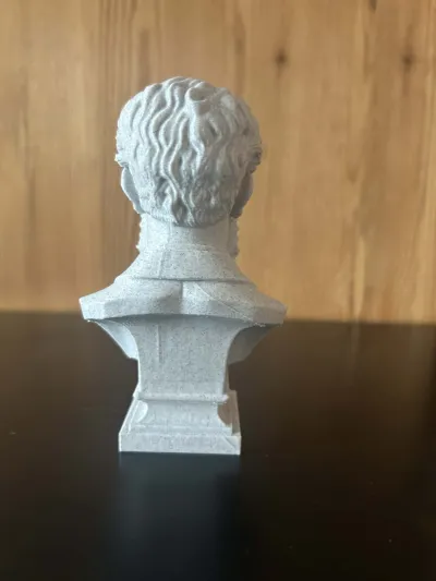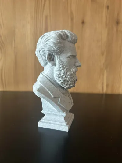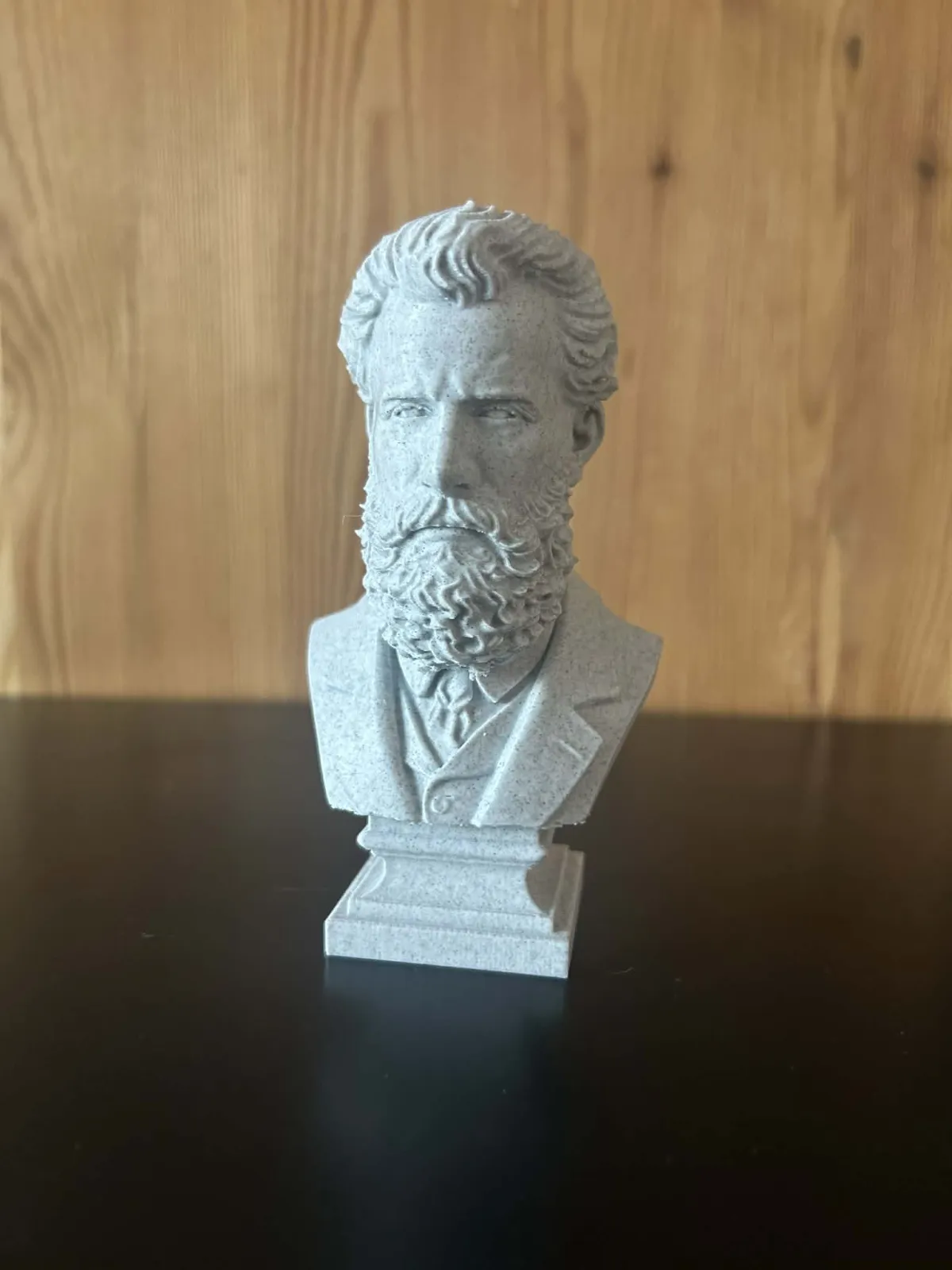 The sculpture is inspired by the most popular photograph of the author, faithfully preserving his proportions and natural expression to provide a representation suitable for 3D printing.