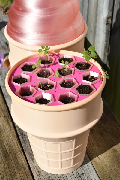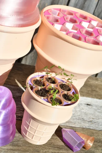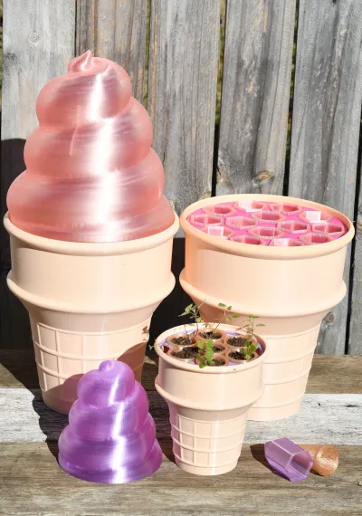 The kit features a playful ice cream cone base topped with a swirl-shaped dome, reminiscent of a soft-serve treat. The dome is printed in transparent PETG, allowing ample sunlight to nourish your seedlings while maintaining a humid environment conducive to growth.