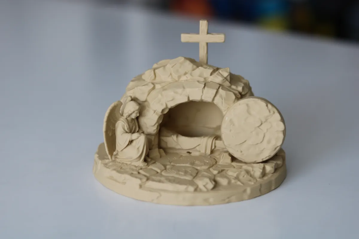 This model represents the empty tomb of Jesus, symbolizing the moment of resurrection. The open stone and the angel beside the tomb reflect the biblical scene of Easter morning.
