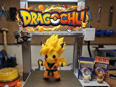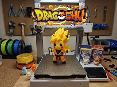 A detailed photograph capturing a unique custom-designed mashup: Dragochu, a Super Saiyan Pikachu hybrid. The figure, in its full Goku gi, is the centerpiece on the build plate of an FDM 3D printer in a cluttered maker workshop. The scene is filled with smaller, unpainted and painted 3D-printed Pokemon figures like Charmander, Bulbasaur, Squirtle, Jigglypuff, and Eevee. Above the printer, a large, stylized Dragochu logo mixes the design elements of both the Pokemon and Dragon Ball logos, complete with integrated Dragon Balls and Poke Balls. Tools, filament spools, and vintage Pokemon card boxes fill the workshop desk. A true celebration of fan culture, creation, and collecting.