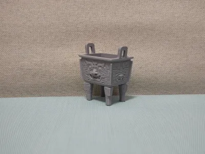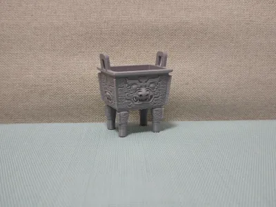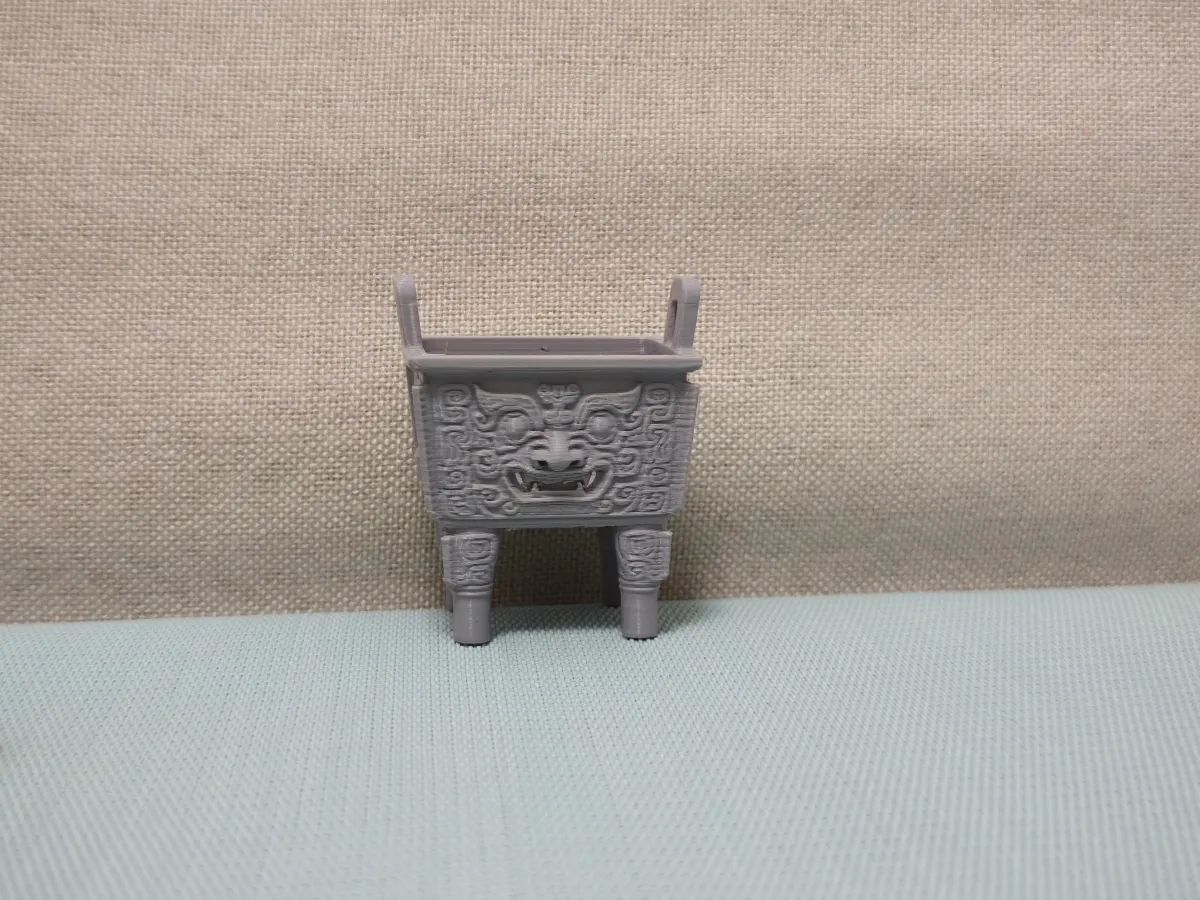 This is a replica model of a Shang Dynasty square ding, with the following key details: 1. **Form and Cultural Context**: - The design faithfully recreates the iconic form of Shang Dynasty square dings: a square body with two ears and four legs, adorned with animal-face motifs—known as taotie patterns—which are hallmark decorations on Shang and Zhou bronze ritual vessels. - As one of China’s most important ceremonial vessels, the ding served both practical functions—such as cooking and sacrificial offerings—and later evolved into a powerful symbol of authority and social hierarchy (e.g., the “Nine Dings” were regarded as emblems of imperial power). The animal-face motifs reflect the religious beliefs and aesthetic sensibilities of the Shang and Zhou dynasties. 2. **Material and Application**: - The model is crafted from gray plastic/resin, featuring visible layer lines typical of 3D‑printed objects. - Primarily intended as a cultural and creative display piece, it highlights the traditional forms of ancient artifacts while also serving as a decorative tabletop accent or an accessory for historical-themed model scenes. 3. **Design Features**: - By meticulously replicating the shape and decorative motifs of the square ding, this model conveys the cultural significance and symbolic value of Shang and Zhou bronze ritual vessels, representing a modern reinterpretation of traditional artifact forms. Based on the ancient bronze square ding, this model stands as a quintessential example of how traditional artifact aesthetics can be beautifully preserved and reimagined in contemporary decorative pieces.
