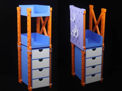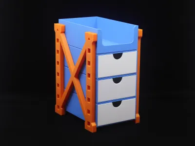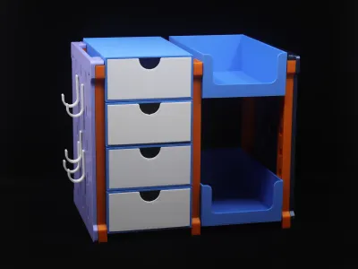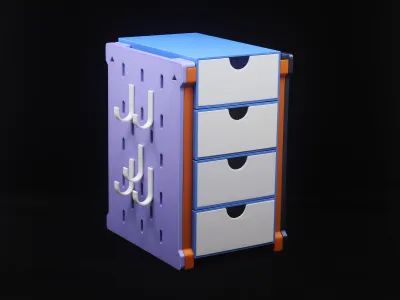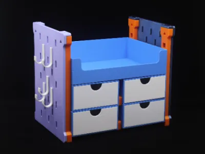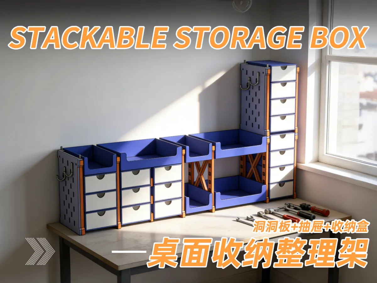 This is a desktop organization system I designed, featuring a large storage box, a small storage box, drawers, and a pegboard. It can be flexibly assembled to suit your needs, helping you neatly organize and declutter your desk while making the most of every inch of surface area. Thanks to its stackable design, it easily accommodates additional storage requirements; the side-mounted pegboard maximizes space utilization by effectively leveraging otherwise underused areas along the sides.