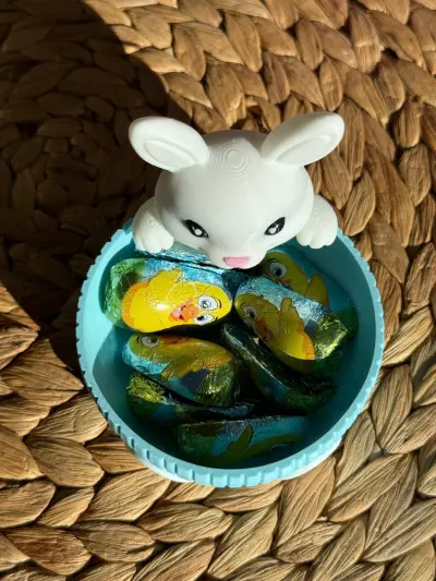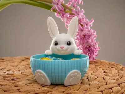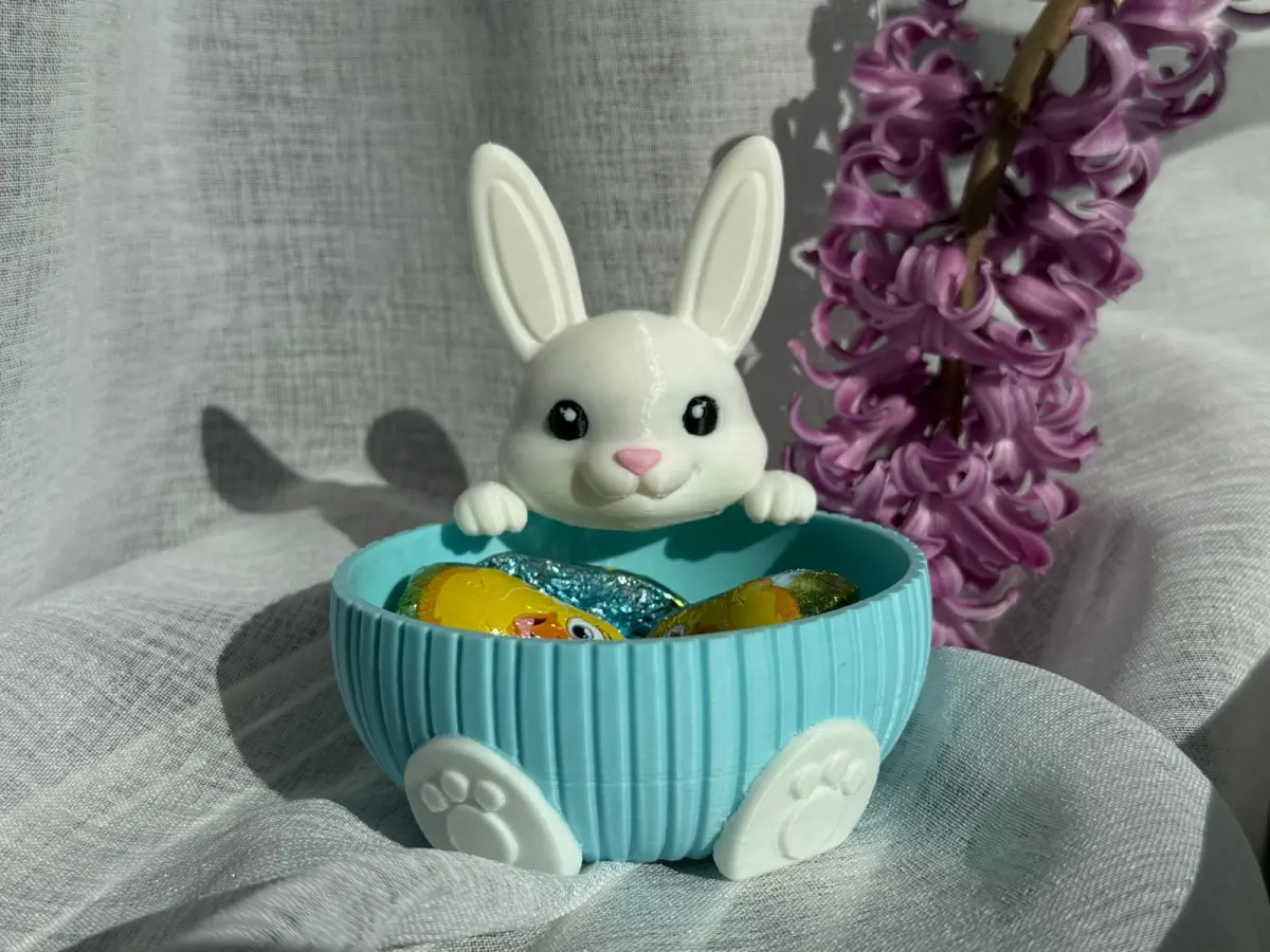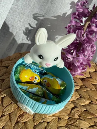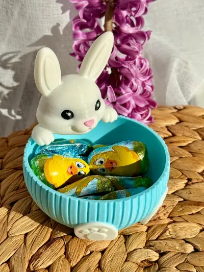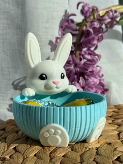 A charming Easter-themed bowl featuring an adorable bunny peeking over the edge. The playful rabbit design adds a cute and festive touch while holding colorful chocolate treats inside. The bowl has a soft blue textured exterior with bunny paw details at the base, making it both decorative and functional.