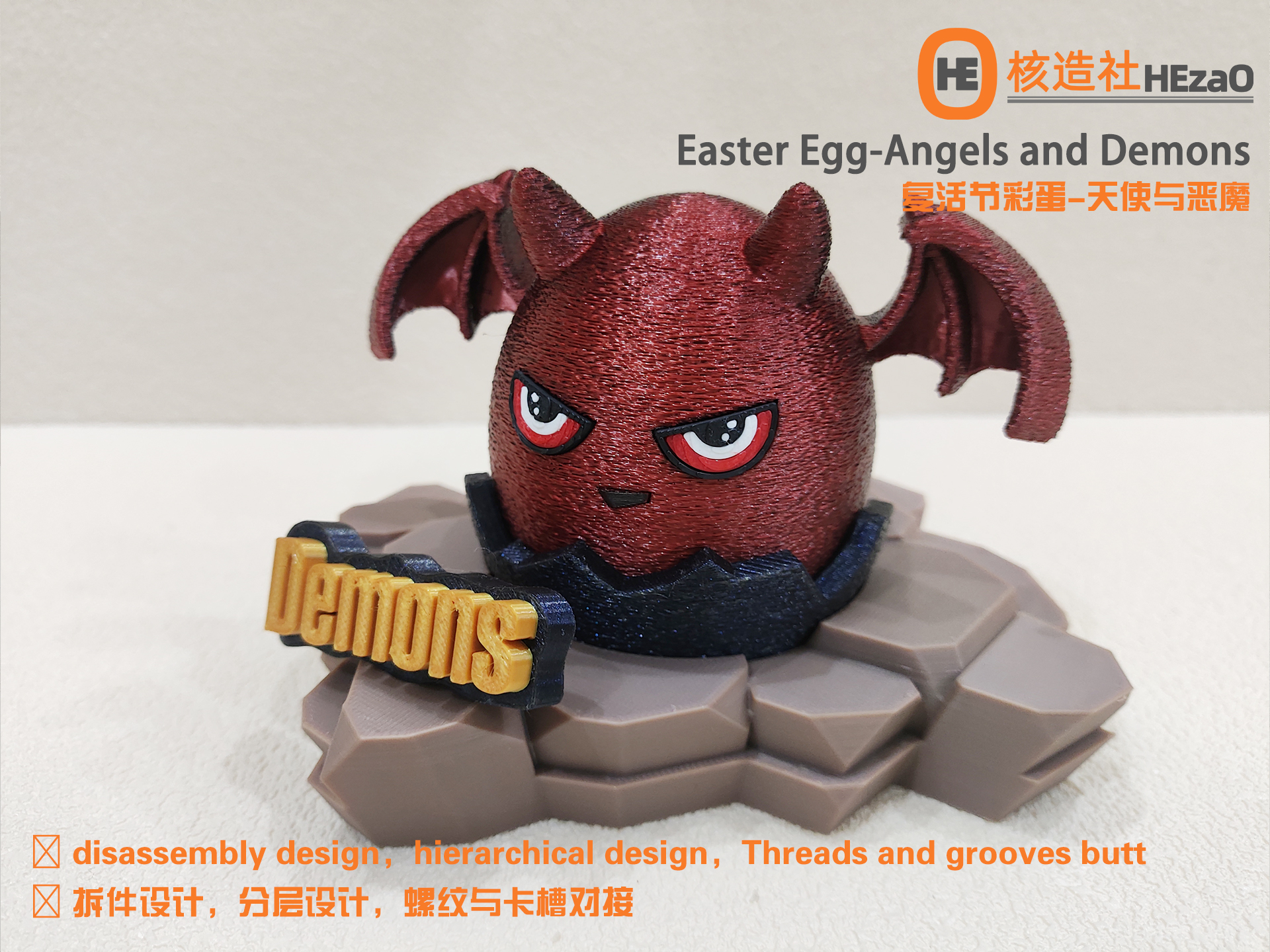 恶魔彩蛋采用恶魔的Q版形象,恶魔之翼,恶魔之角,直角的蛋壳,岩石底座。