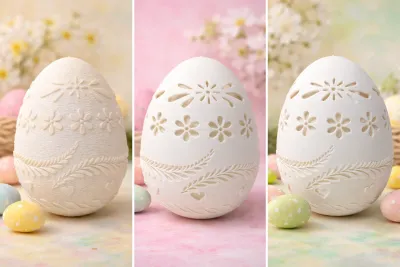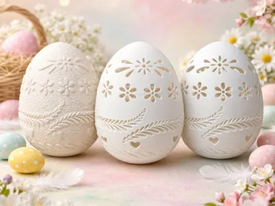 Set of three decorative Easter eggs designed for 3D printing, each featuring a different level of surface detail and cut-through pattern. Perfect for seasonal decorations, table display, or Easter baskets.
