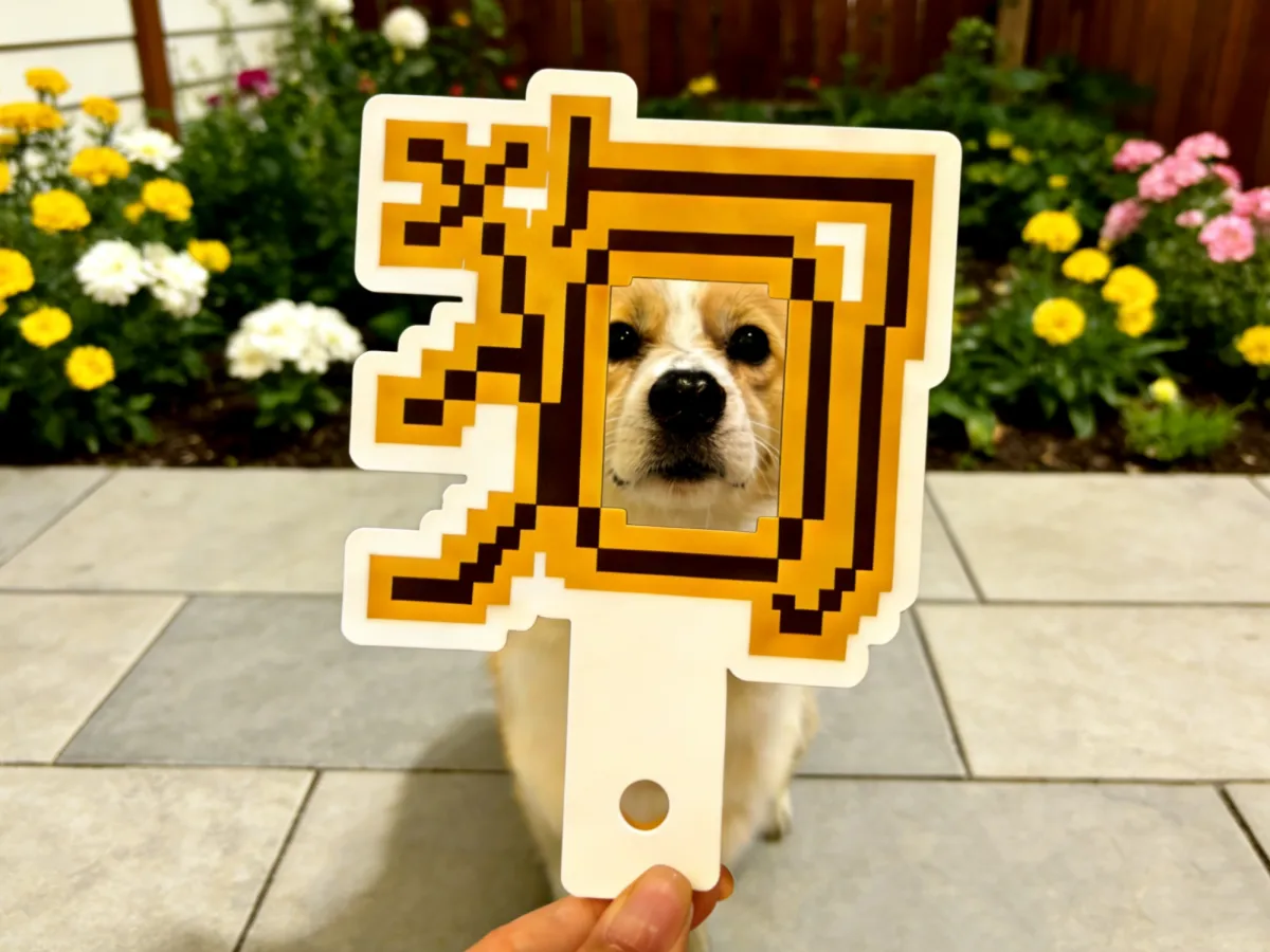 This viewfinder frame requires three colors and has a height of 15 cm, making it ideal for taking photos and checking in with your pet.