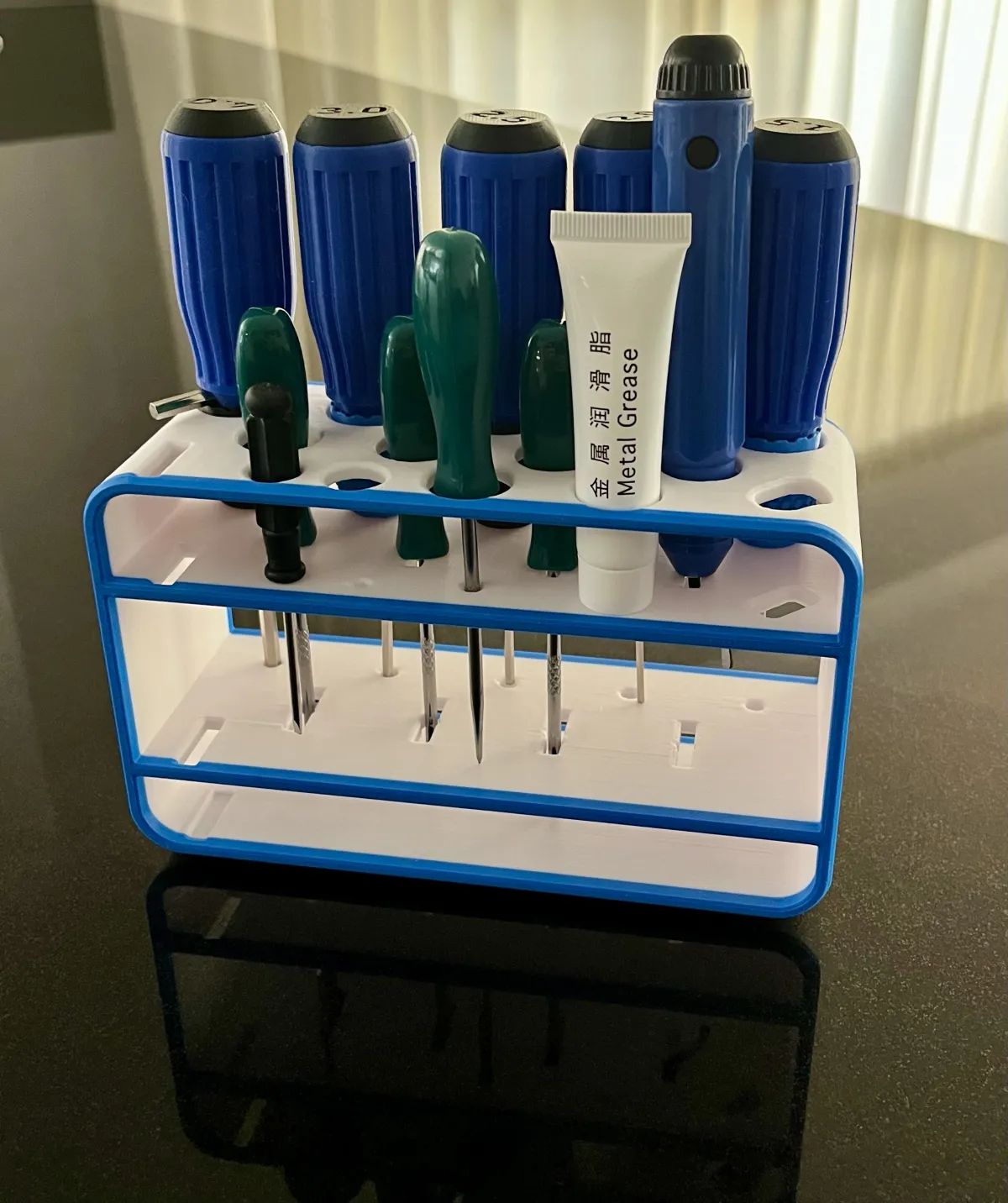 This tool holder is ideal for workshops, workbenches or personal desks needing organised storage for screwdrivers, grease tubes, and other small tools.