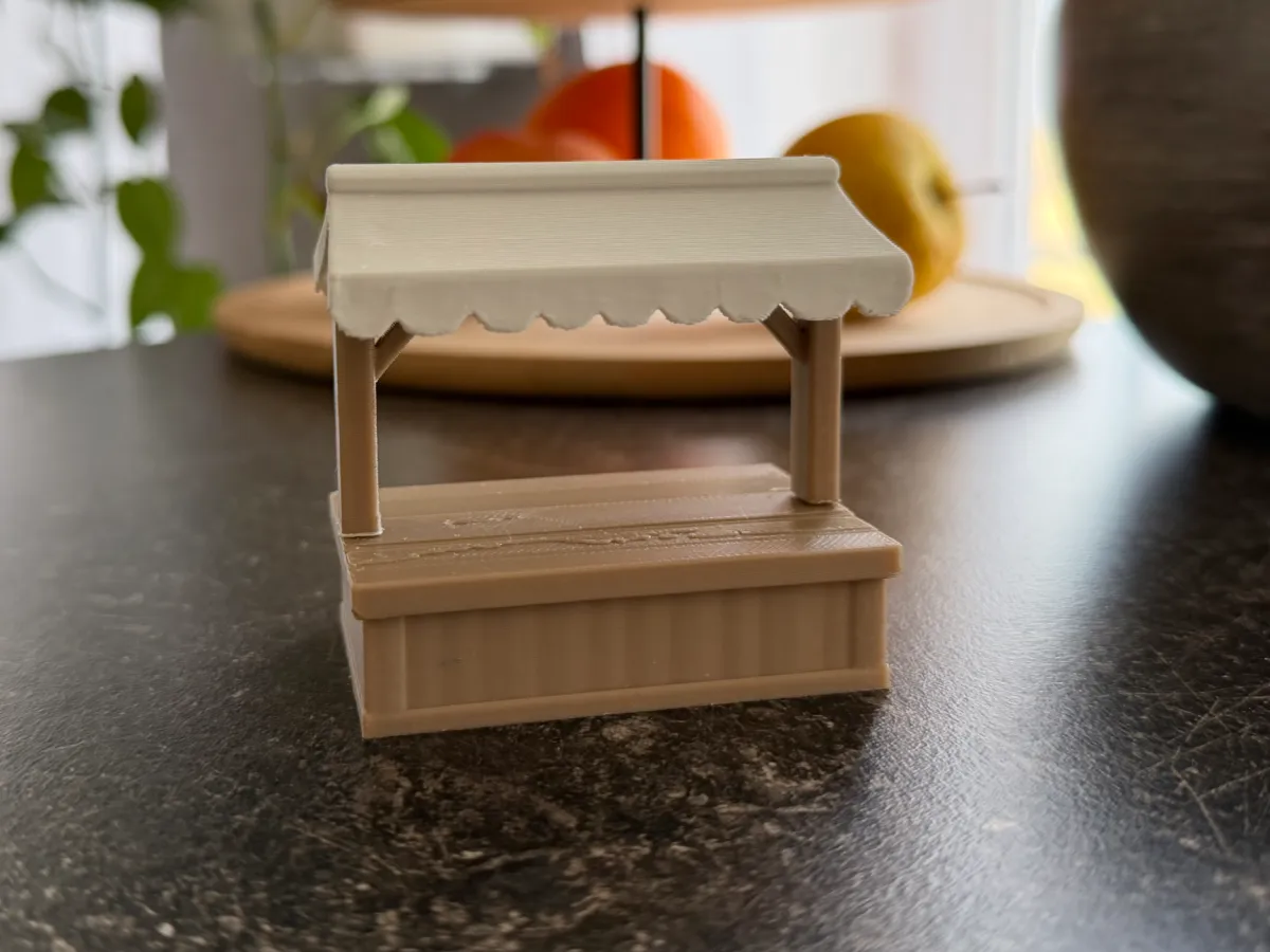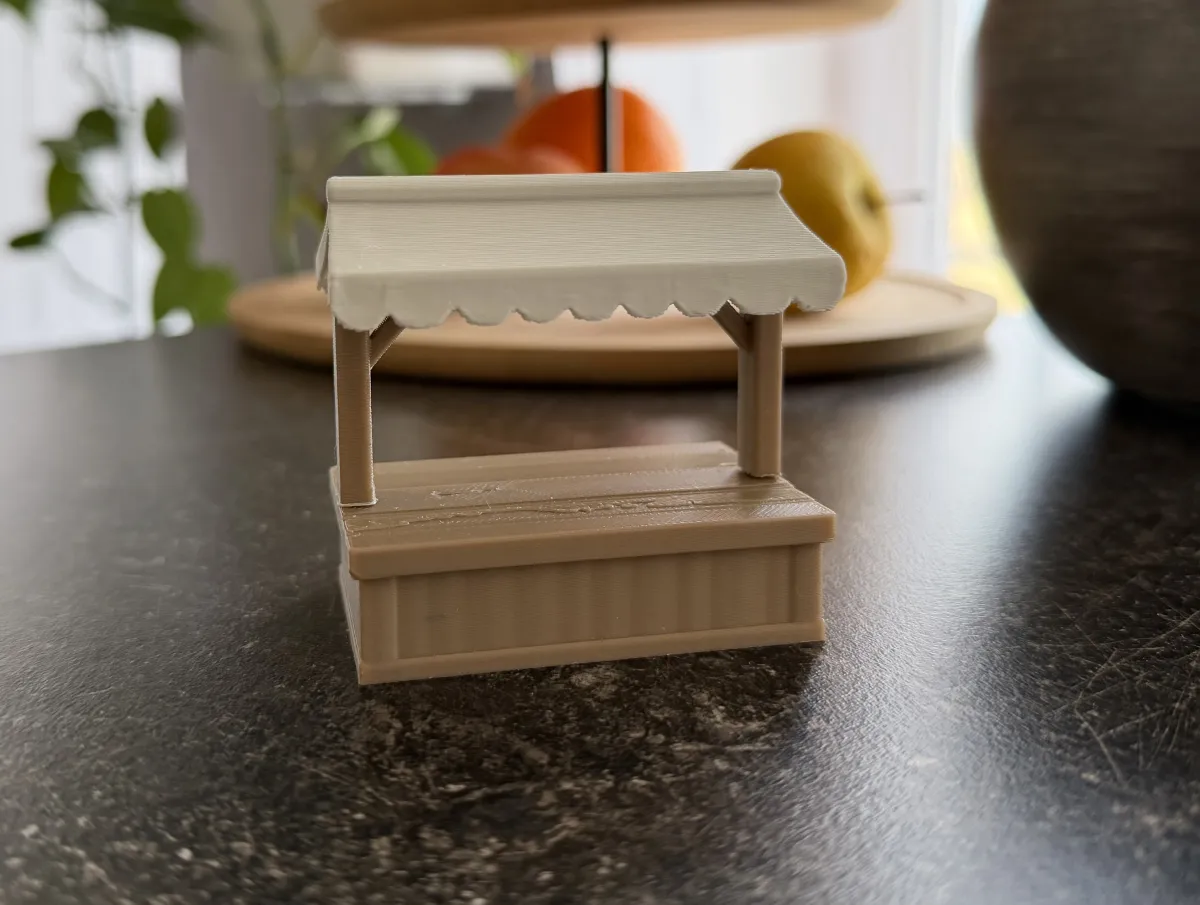 - Classic market stall silhouette with a sturdy wooden base and roof