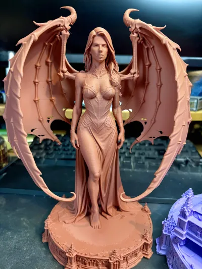 From her back, vast, sculptural wings unfolded—beautiful in form, yet carrying something ancient within them. The room seemed to hold its breath.