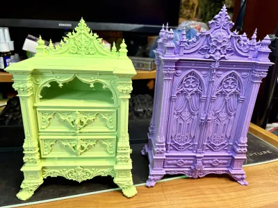 The gothic cabinets and wardrobes are not merely decorative—they remain fully functional in miniature form, offering small hidden storage, as if they too were keeping secrets of their own.
