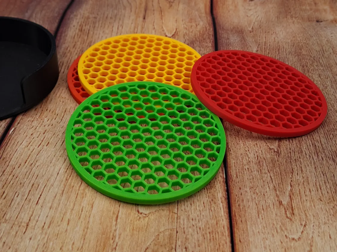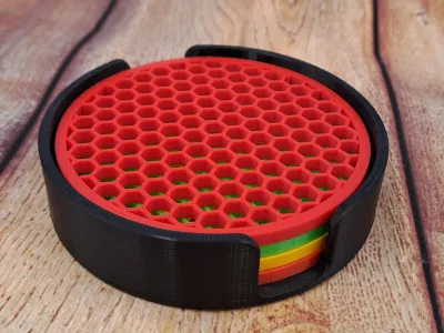 Clean and practical 3D printed coaster set with a matching holder. The honeycomb pattern gives the coasters a modern look while keeping them lightweight and strong.