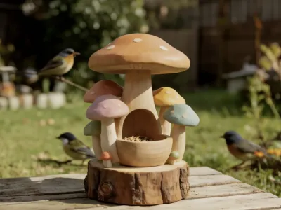 This 3D‑printed bird feeder draws inspiration from a whimsical fairy‑tale mushroom house, crafted in one seamless piece using eco‑friendly resin. The cap and stem feature crisp, well‑defined textures and soft, natural hues, while the built‑in feeding tray makes it easy to dispense grains. A cluster of multi‑colored little mushrooms surrounds the main structure, adding a touch of childlike charm and visual depth, while the solid, weather‑resistant wooden base ensures stability and longevity. Combining practical functionality with aesthetic appeal, this piece not only enhances the garden with a warm, inviting ambiance but also provides an ideal habitat and feeding station for birds—truly a creative fusion of nature and craftsmanship.