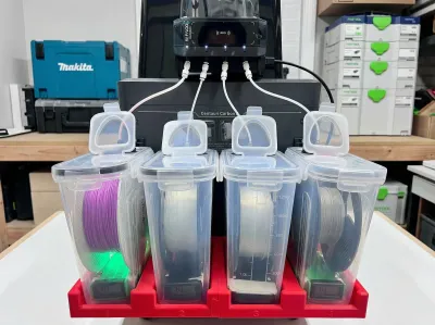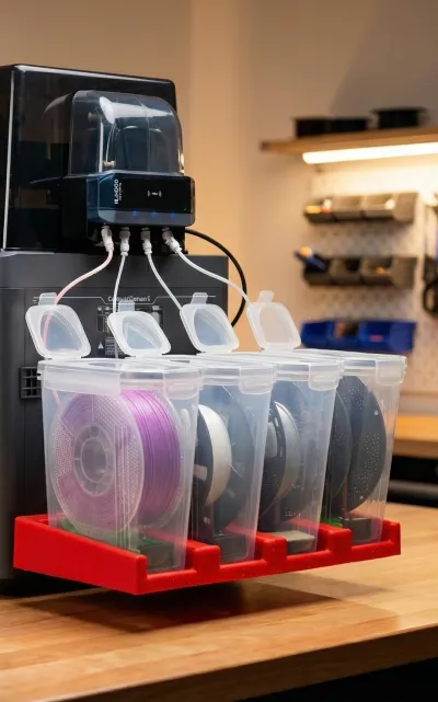 This modular system is engineered to securely hold four standard "cereal container" style filament dryboxes side-by-side. It perfectly aligns your PTFE tubing straight to your multi-material hub, preventing snags, tangles, and feeding errors.