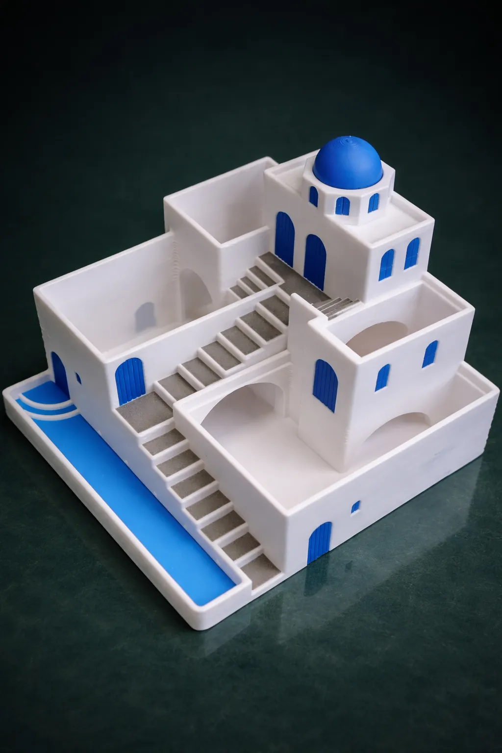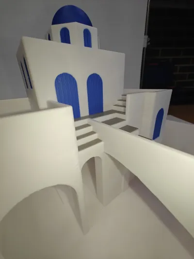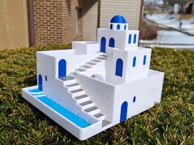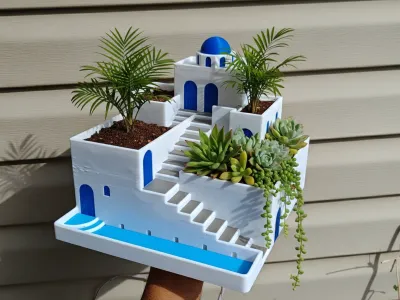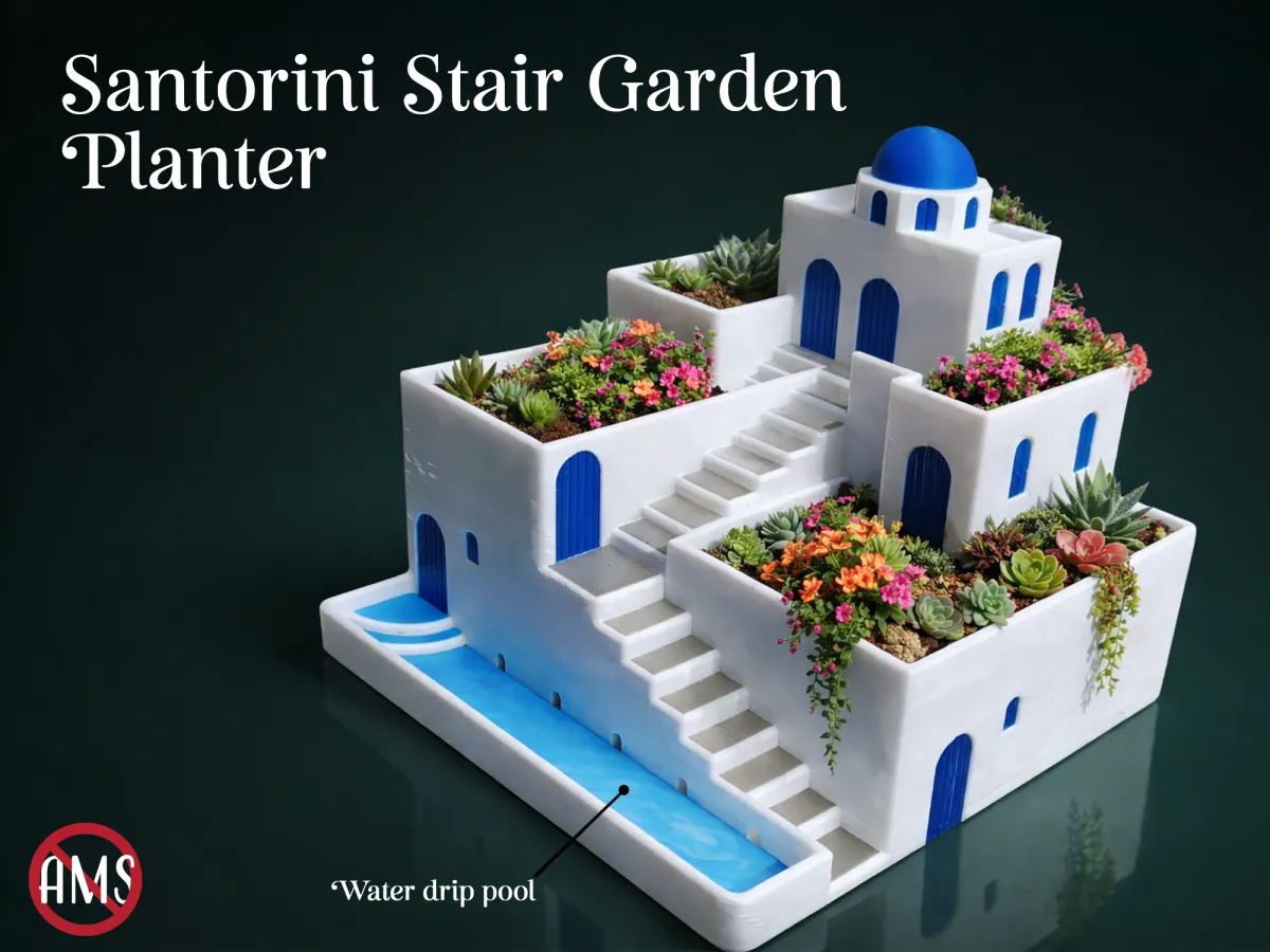Bring the calm beauty of the Greek islands to your desk, shelf, or garden with this Greek Santorini-inspired stepped terrace planter. Designed with clean and high-detail white architecture, blue dome accents, cascading stairs, and layered planting beds, this model captures the peaceful charm of Mediterranean cliffside homes in a compact decorative form. Each terrace is shaped to hold plants, creating a living architectural scene that evolves as your plants grow.