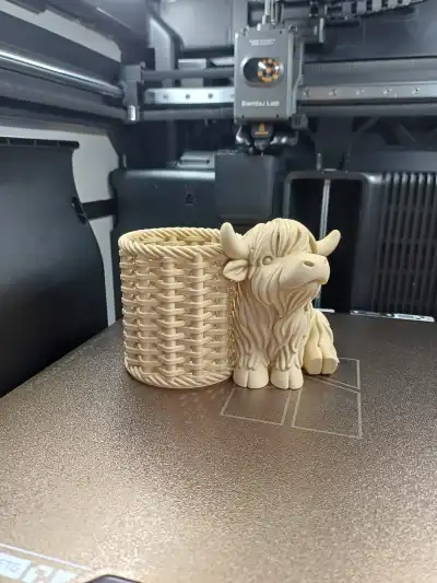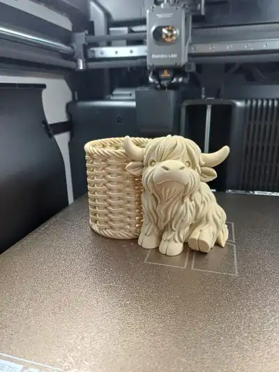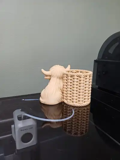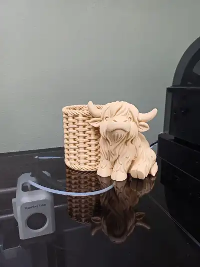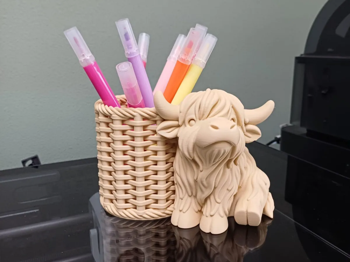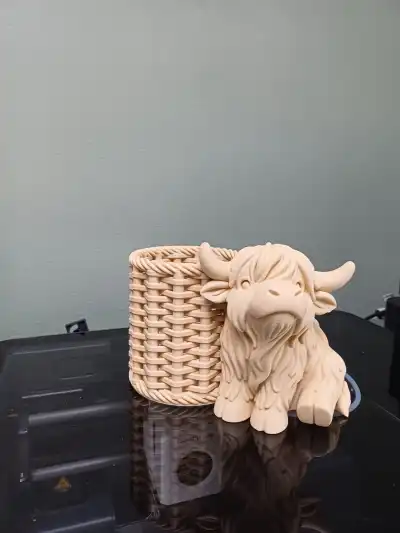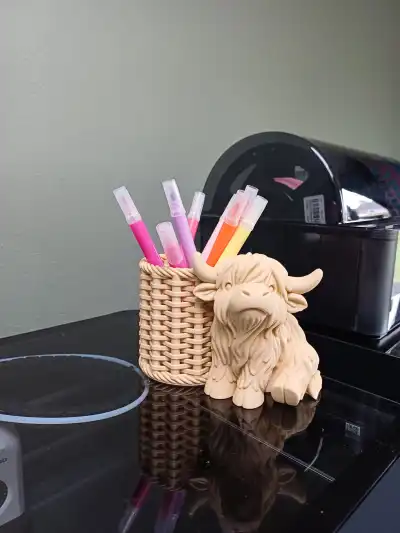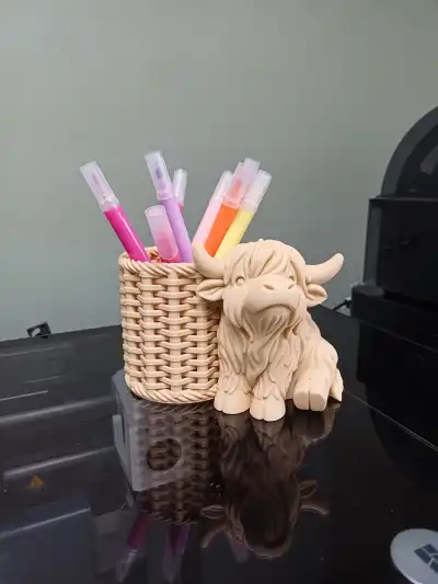 A charming Highland cow pen holder with a cozy woven-style basket, perfect for keeping your favorite pens organized.